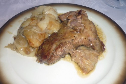 Cordero asado, Lammbraten mit Kartoffeln, sehr schönes mürbes Fleisch, mit einem interessanten Lammgeschmack.
