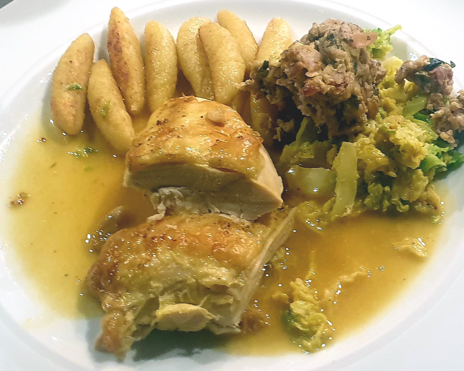 Am vierten Tag. Hähnchenbrust mit Kartoffelpüree und Spitzkohl. Dazu Salbeisauce.