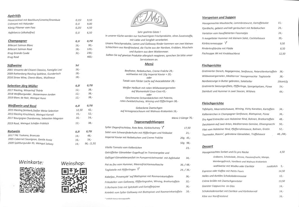 Sieben Tage Sylt, da darf Jörg Müller natürlich nicht fehlen. Jörg Müller sorgt mit seiner kreativen Sylter Frischeküche mit französischem Einschlag dafür, dass sich die Gäste sowohl in der ehemaligen „Gourmetstube“ aber auch im „Pesel“ wohlfühlen. Auch ohne Auszeichnungen immer wieder ein Genuss. Der Service, geführt von Tochter Jane Müller und Schwiegersohn Ben Birkholz (Big Ben), ist ohne Fehl und Tadel.