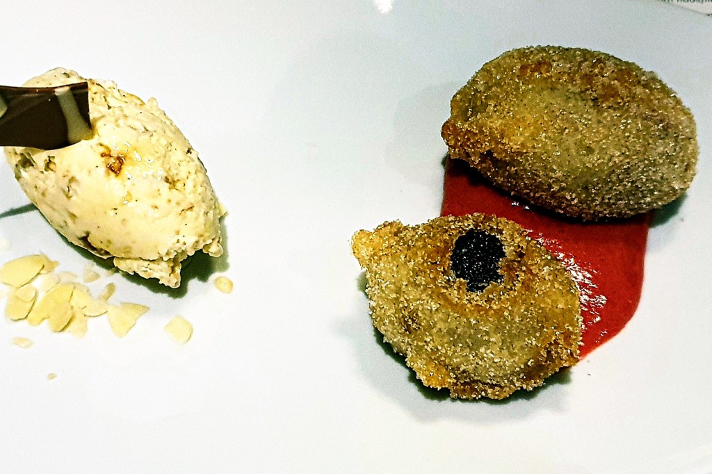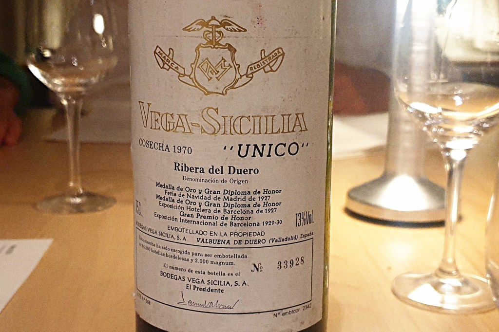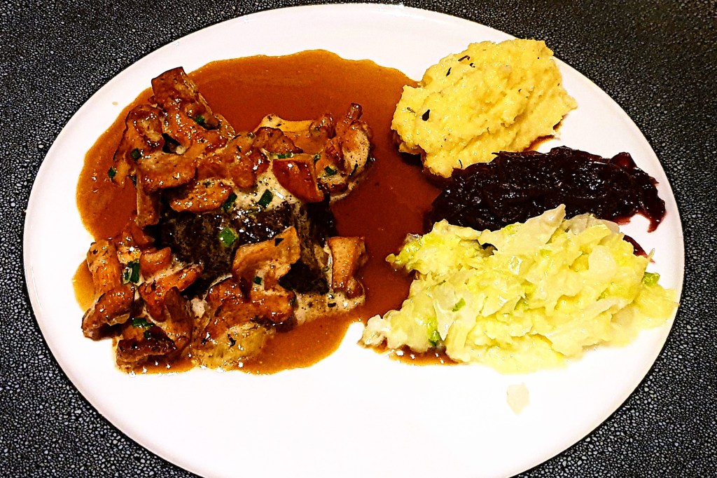 Höhepunkt des Menüs ist das geschmorte Ochsenbäckchen mit Polenta, rotes Zwiebel Chutney, Wirsing und Pfifferlinge. Dem Anlass entsprechend hatte ich einen Vega Sicilia Unico Jahrgang 1970 ausgesucht. Obwohl er ja 50 Jahre auf den „Buckel“ hatte, machte er noch einen sehr frischen Eindruck, nichts da von Altersproblemen etc. Mit ca. 16° hatte er auch die richtige Trinktemperatur.