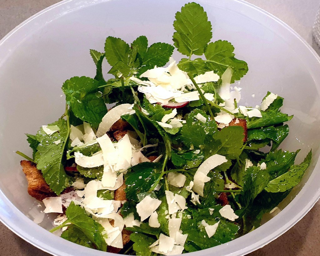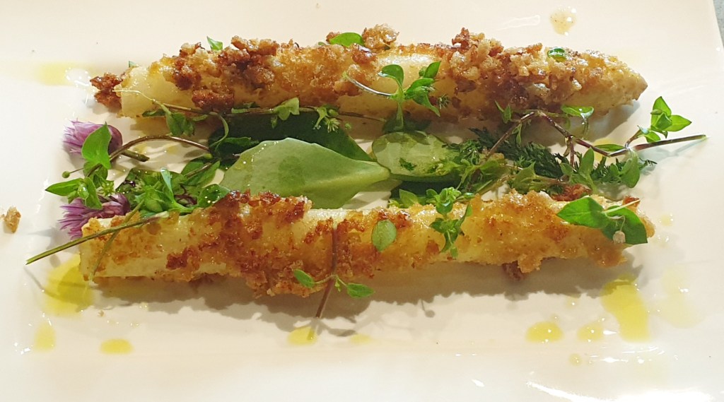 Spargel schälen, putzen, ca. 5 Minuten im 100° heißem Dampfgarer ca. 5 Min. garen und auf Küchenpapier abtropfen lassen. Bio- Eier verquirlen und mit Salz und Pfeffer würzen. Als Paniermehl nehme ich selbst hergestelltes aus Dinkelbrot(brötchen). Spargelstangen in Mehl, Ei und Paniermehl wälzen. Butterschmalz in einer Pfanne erhitzen und Stangenspargel von allen Seiten goldgelb braten. Dazu einen aus dem eigenen Garten gepflückten Salat und Blüten.