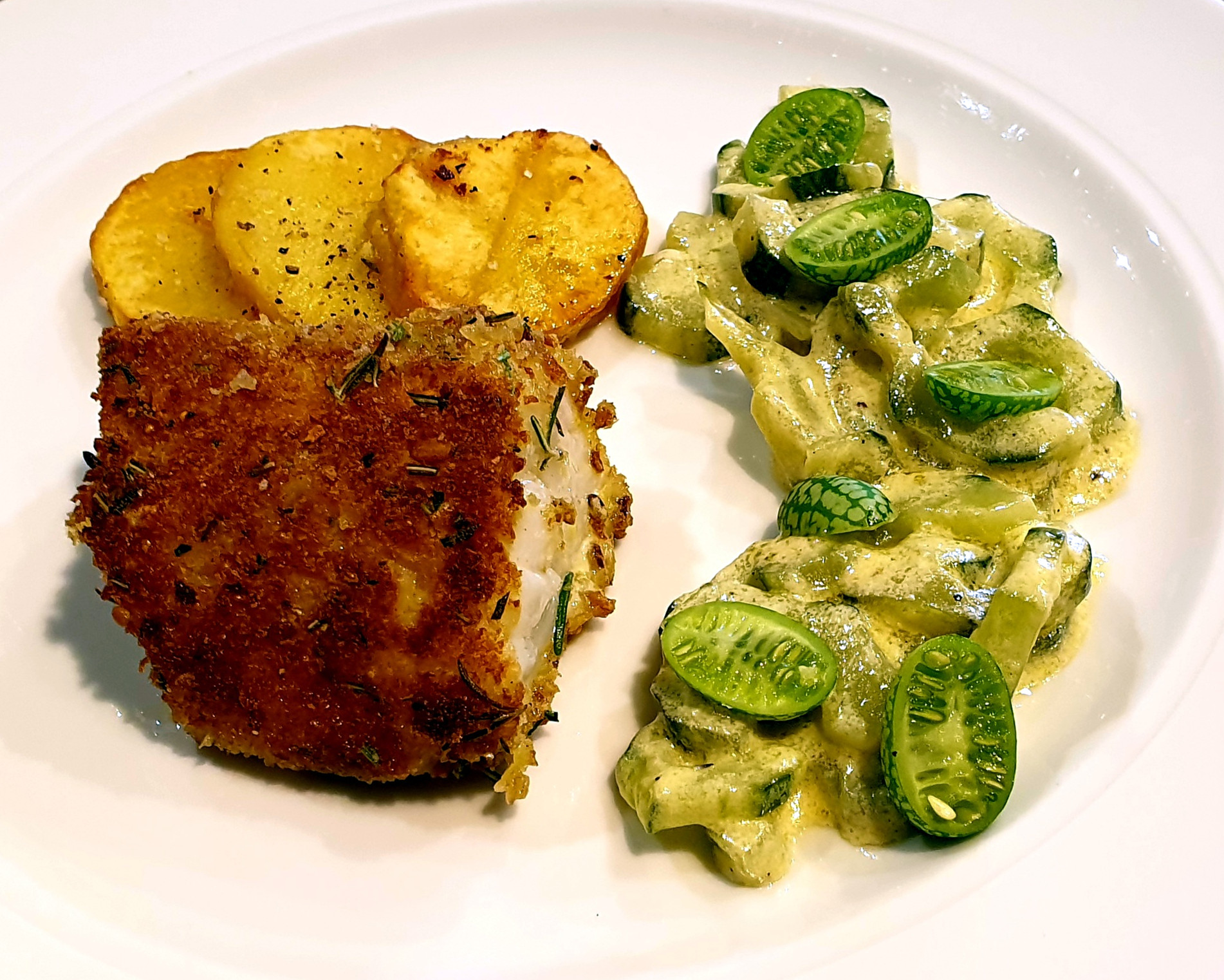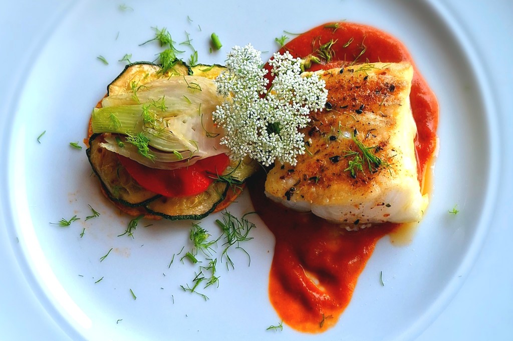 Kabeljau gebraten auf einer Tomatensauce, dazu ein Gemüsetürmchen a la Ratatouille.