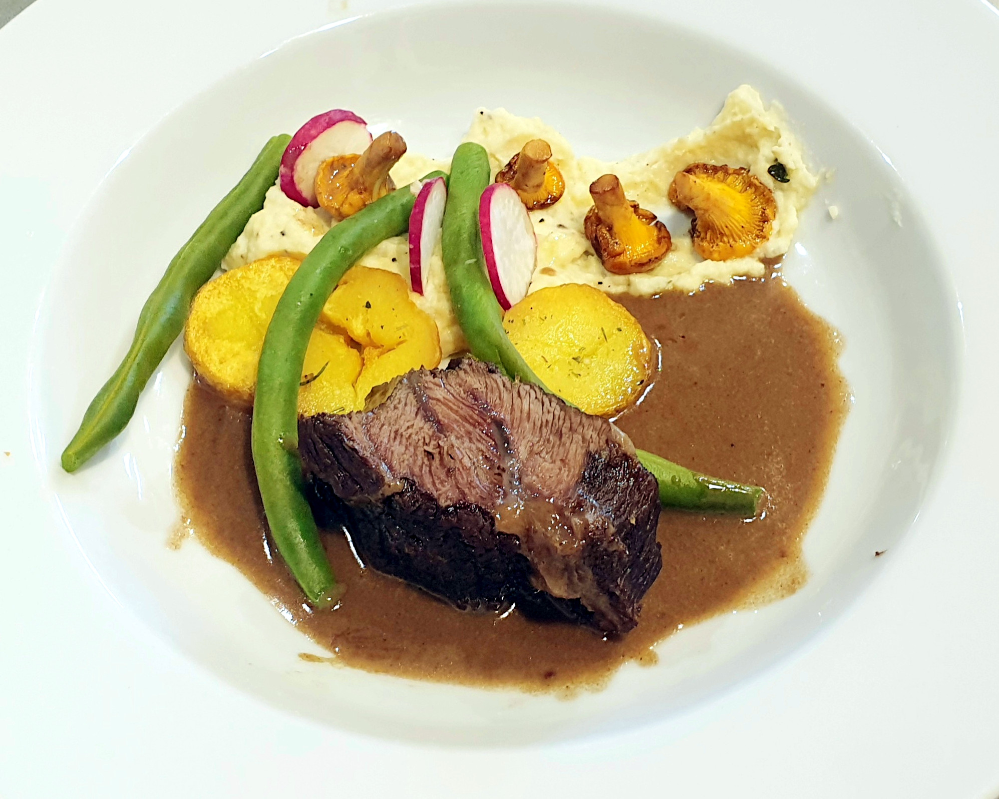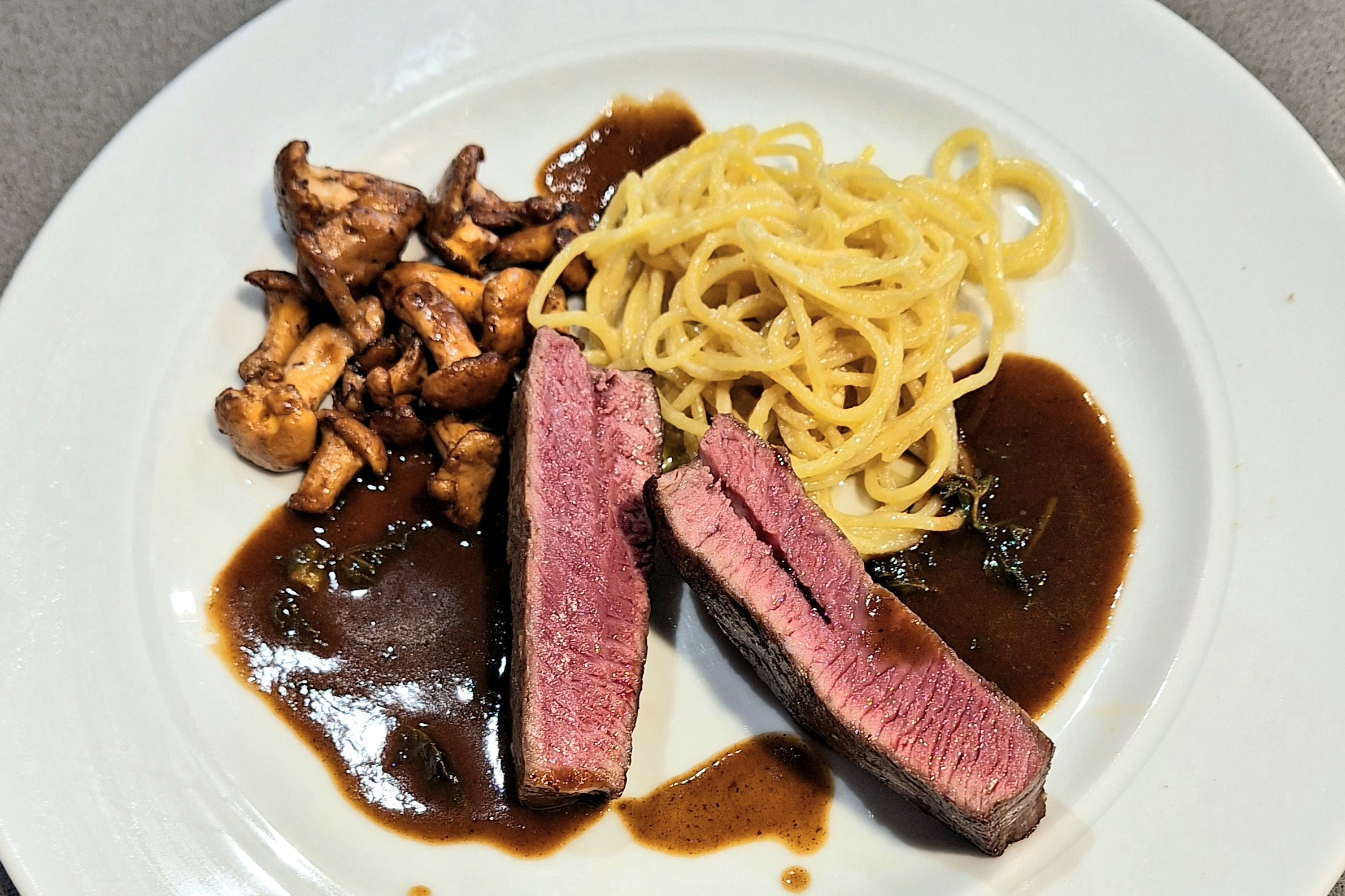 Lammrücken mit 53° Innentemperatur, Spagetti, Pfifferlinge, Thymiansauce