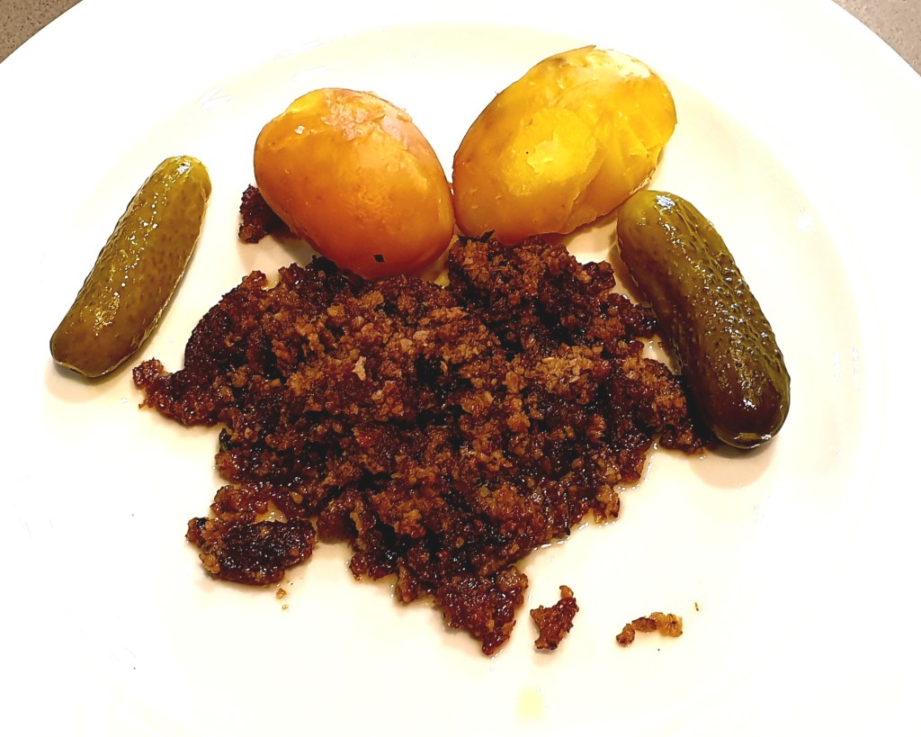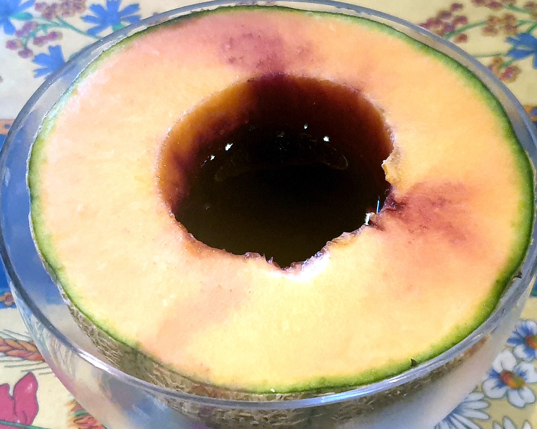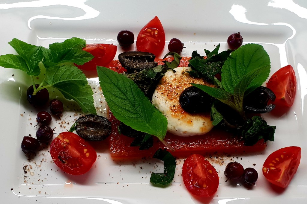 Eine ca. 1 cm dicken Scheiben von der Wassermelone in Olivenöl von beiden Seiten sanft anbraten. Auf einem flachen Teller anrichten. Eine Scheibe Picandou Ziegentaler halbieren, auf die Melone legen, mit Rohrzucker bestreuen und mit einem Bunsenbrenner karamellisieren. Halbierte Oliven und Tomatenviertel darauf verteilen. Mit Basilikum, Gierschblätter (aus dem eigenem Garten) garnieren. Mit Pfeffer und Limonen-Olivenöl verfeinern.