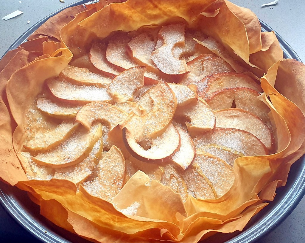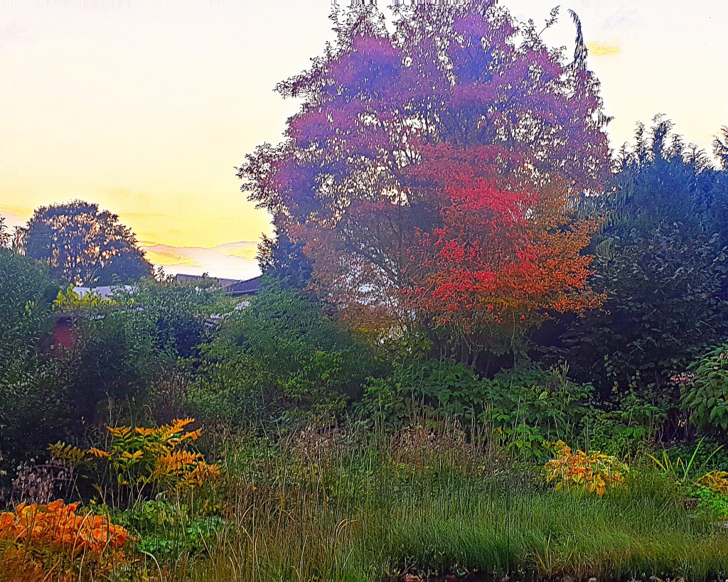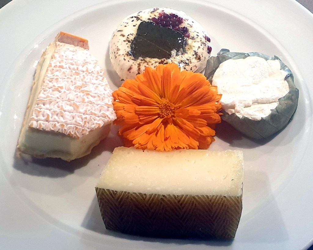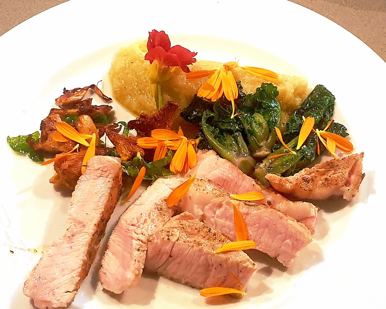 Blumenkohlpüree, Karotten, Pfifferlinge, Blumenkohl weiß gebraten, Blumenkohl rosa blanchiert, Kürbissauce.Scheiben vom Kalbskotelett, Pfifferlinge, Flower Sprouts, Kartoffelpüree mit Olivenöl.Käse, Schaf und ZiegeApfeltarte mit Yufka TeigblätternBlick in den Garten. Felsenbirne mit Herbstlaub
