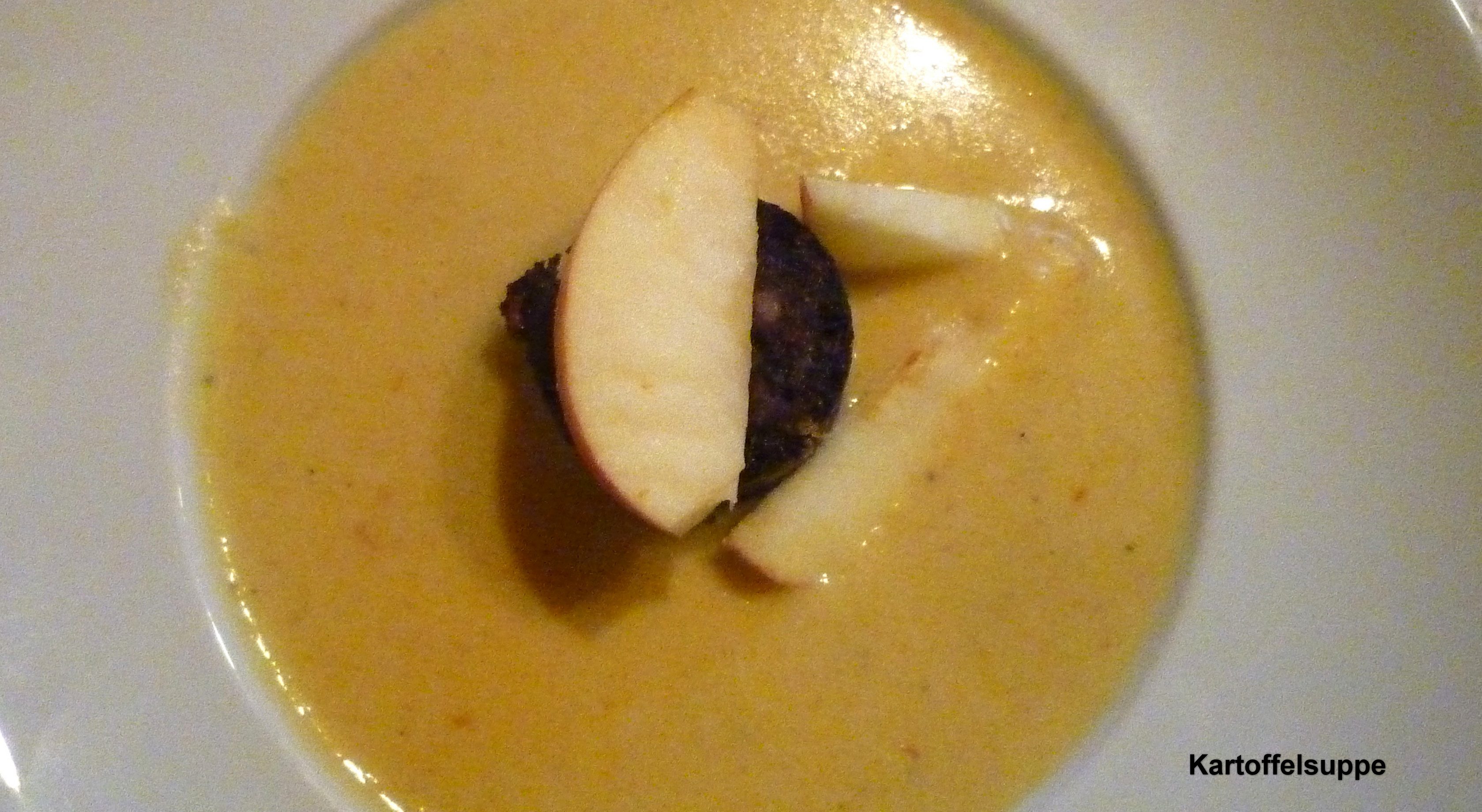 Die Blutwurstscheiben mit etwas Mehl bestäuben und in Butterschmalz ausbacken. Die Suppe in Teller verteilen und jeweils eine Scheibe der Blutwurst sowie Apfelspalten in die Mitte legen.