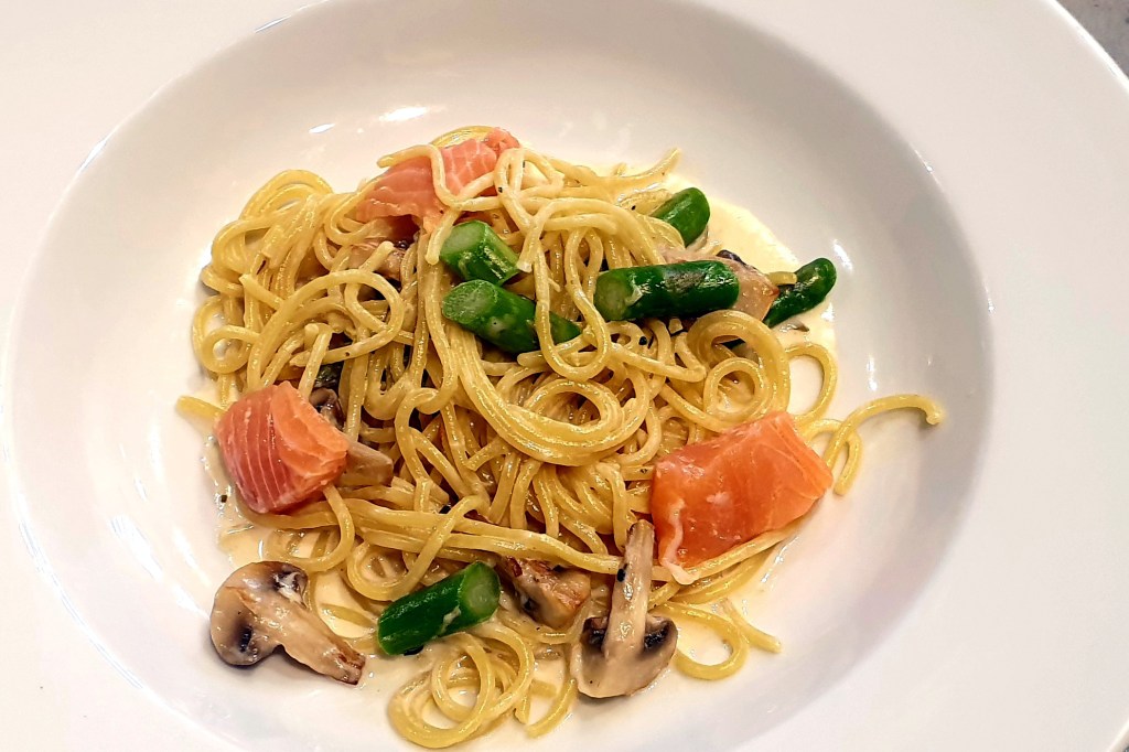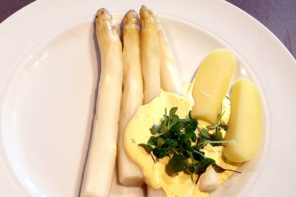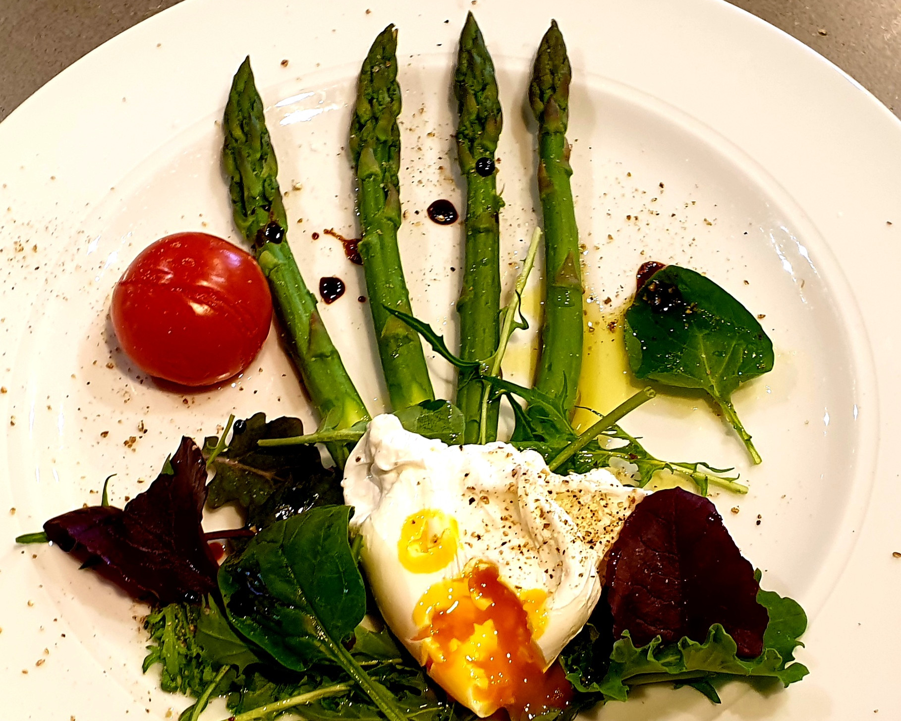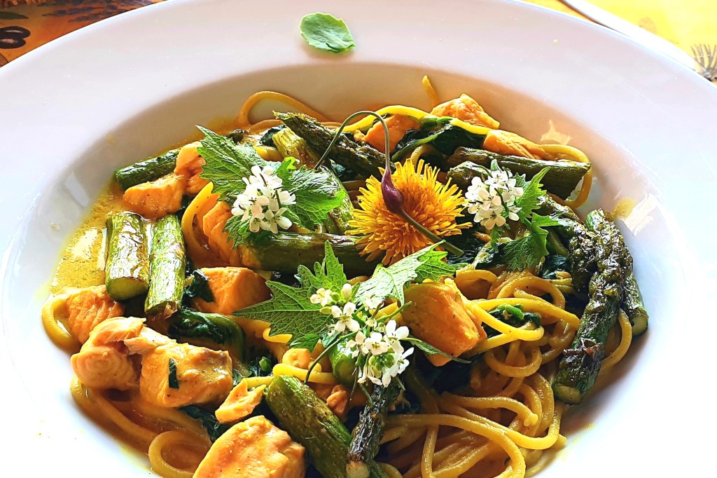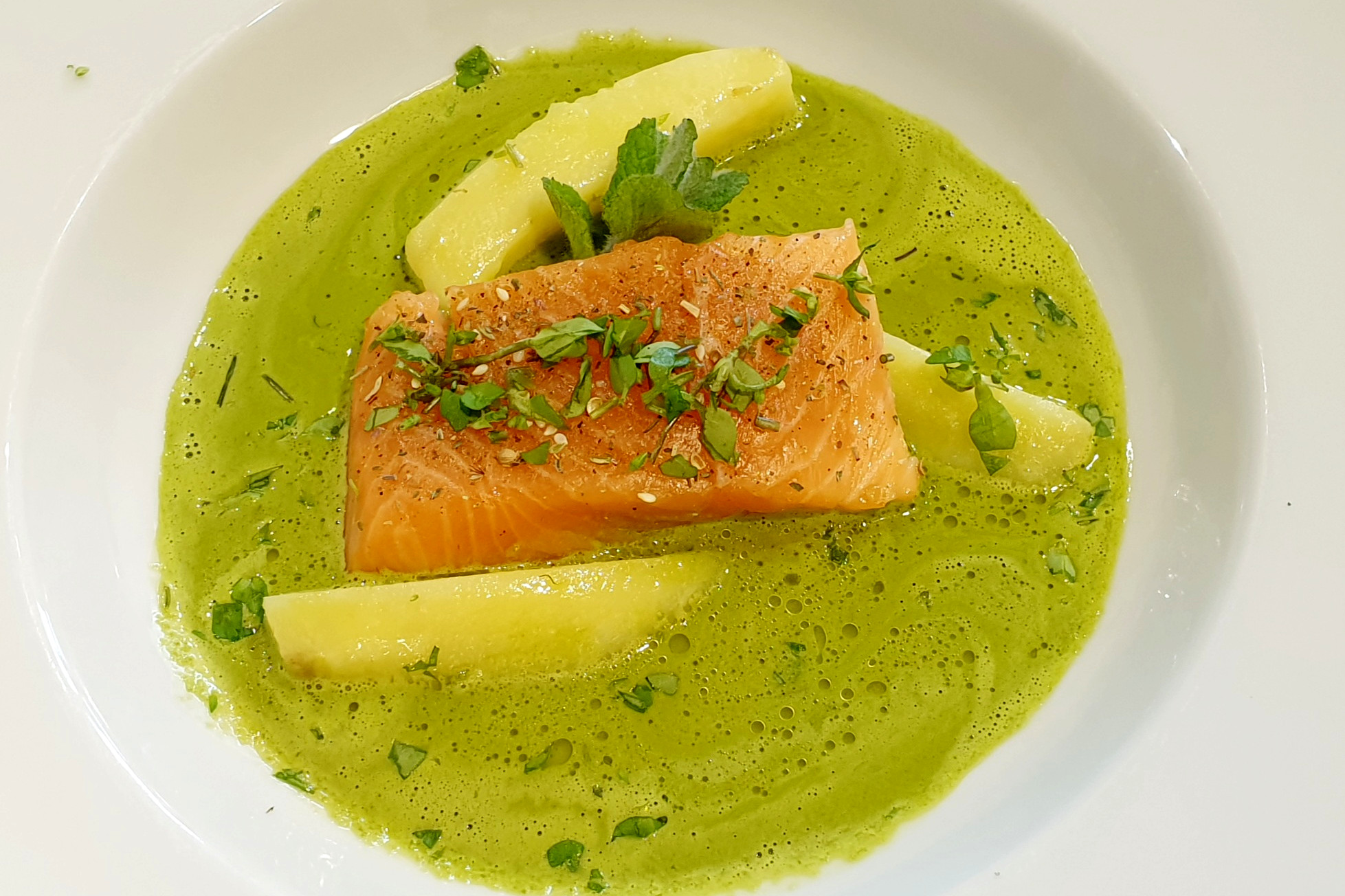 Der erste Spargel der Saison mit Lachs und grüner Soße. Bei der Kräutermischung war ein Kraut dabei, dass die Soße nicht so leuchtend grün machte wie am Samstagmittag
