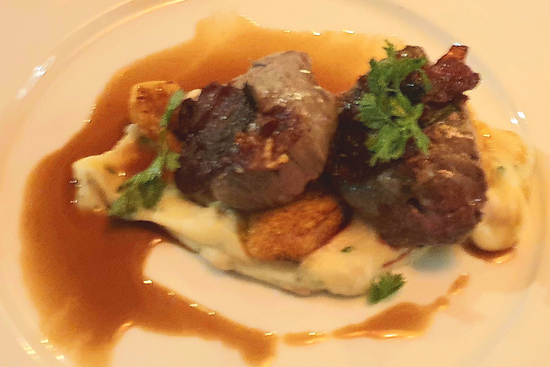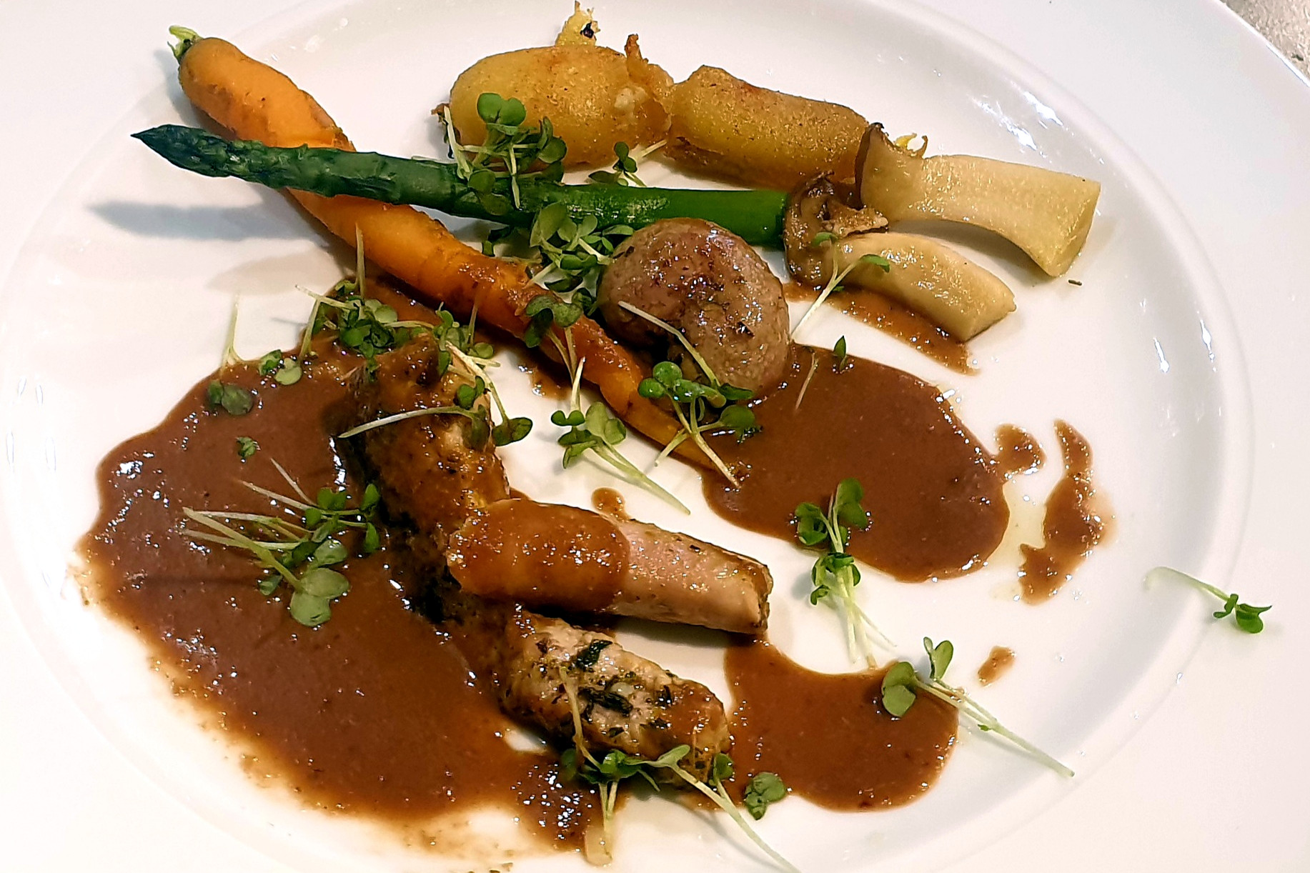 Zickleinrücken, Spargel, Brokkoli, Kartoffelgratin, Buttersauce