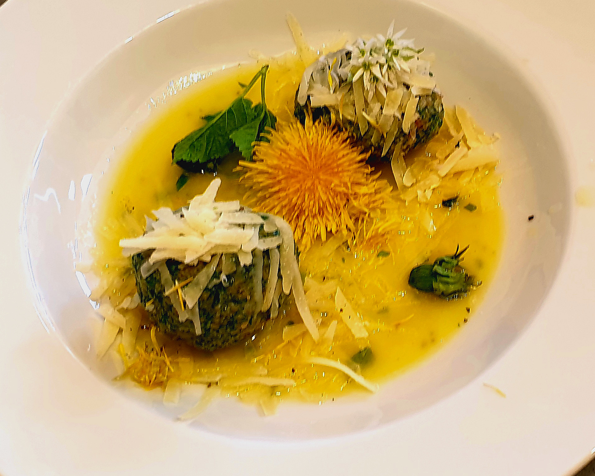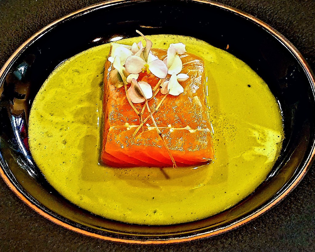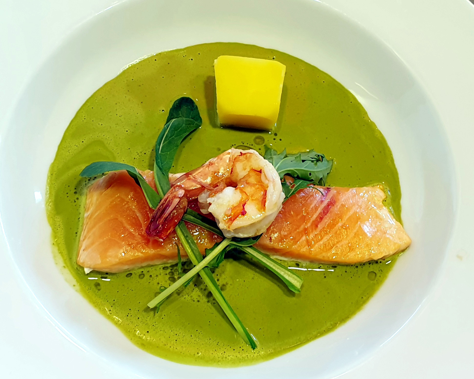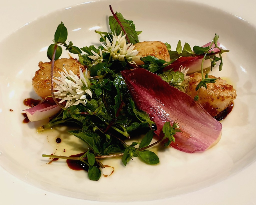 Kammmuscheln, grüne Soße (Kräuter der Kasseler Mischung), Karotte, Blüten
