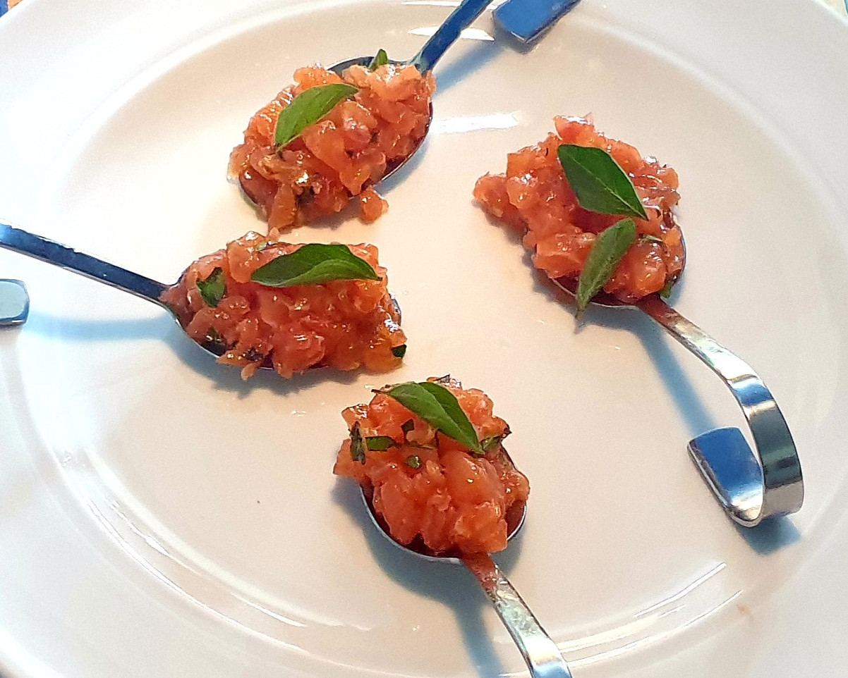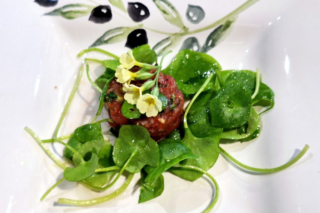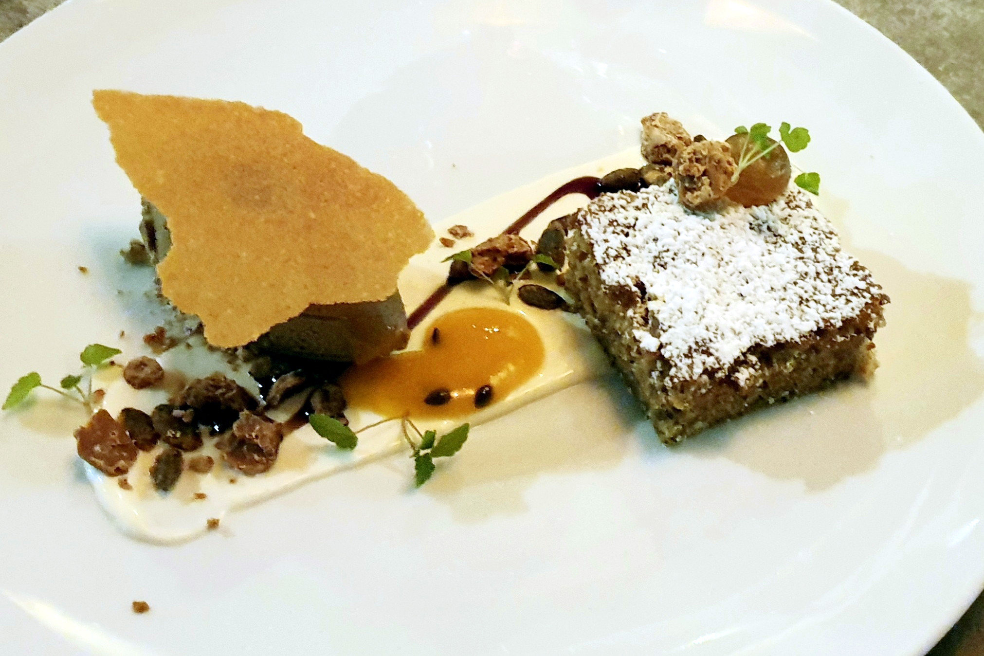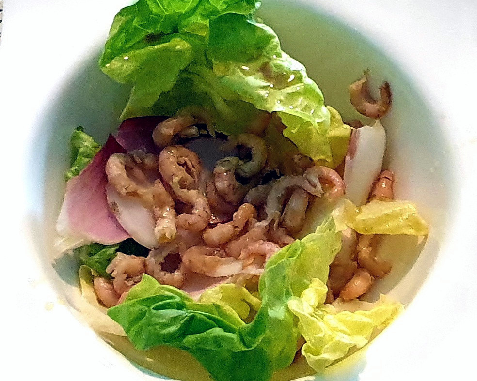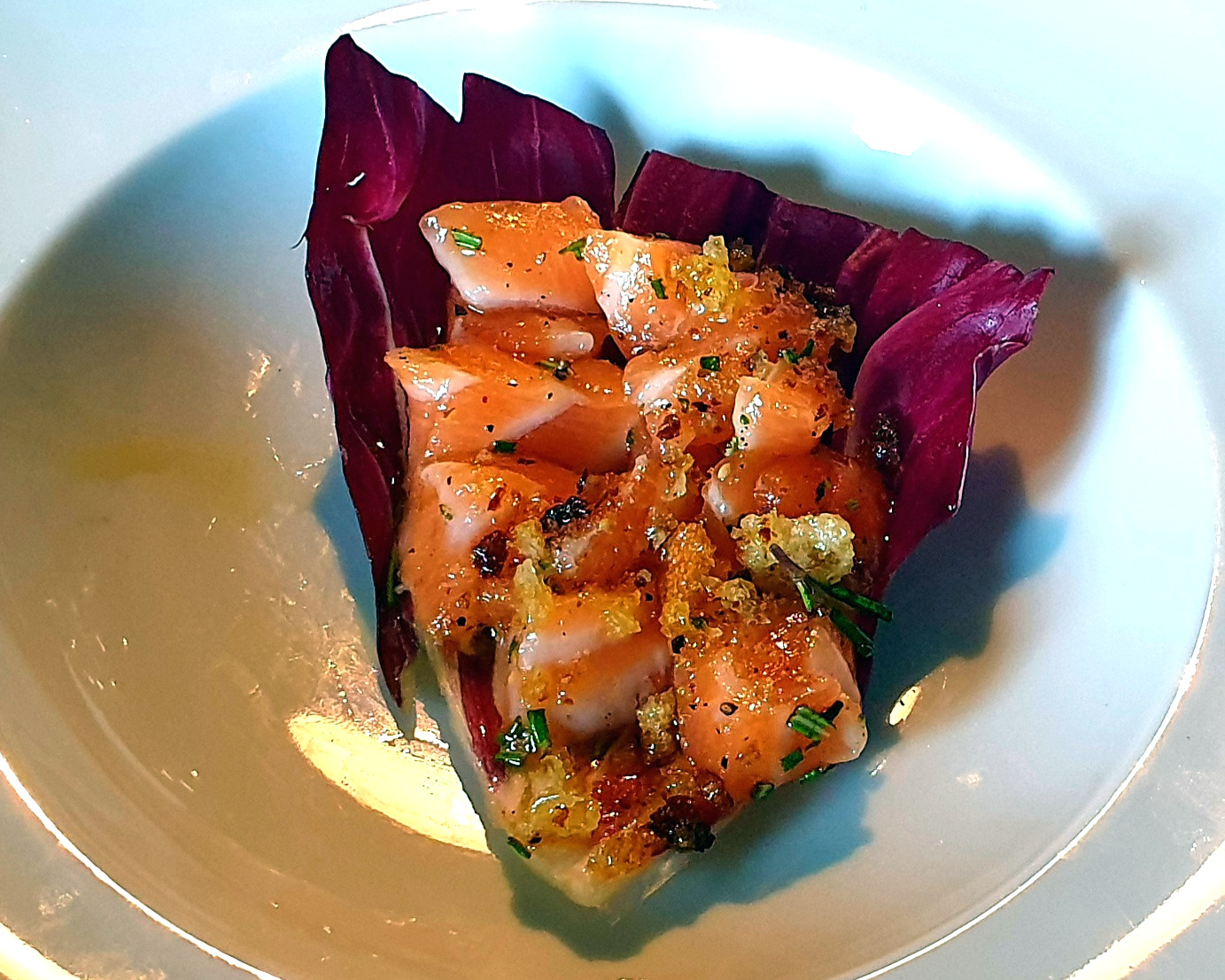 Kammmuscheln, grüne Soße (Kräuter der Kasseler Mischung), Karotte, Blüten
