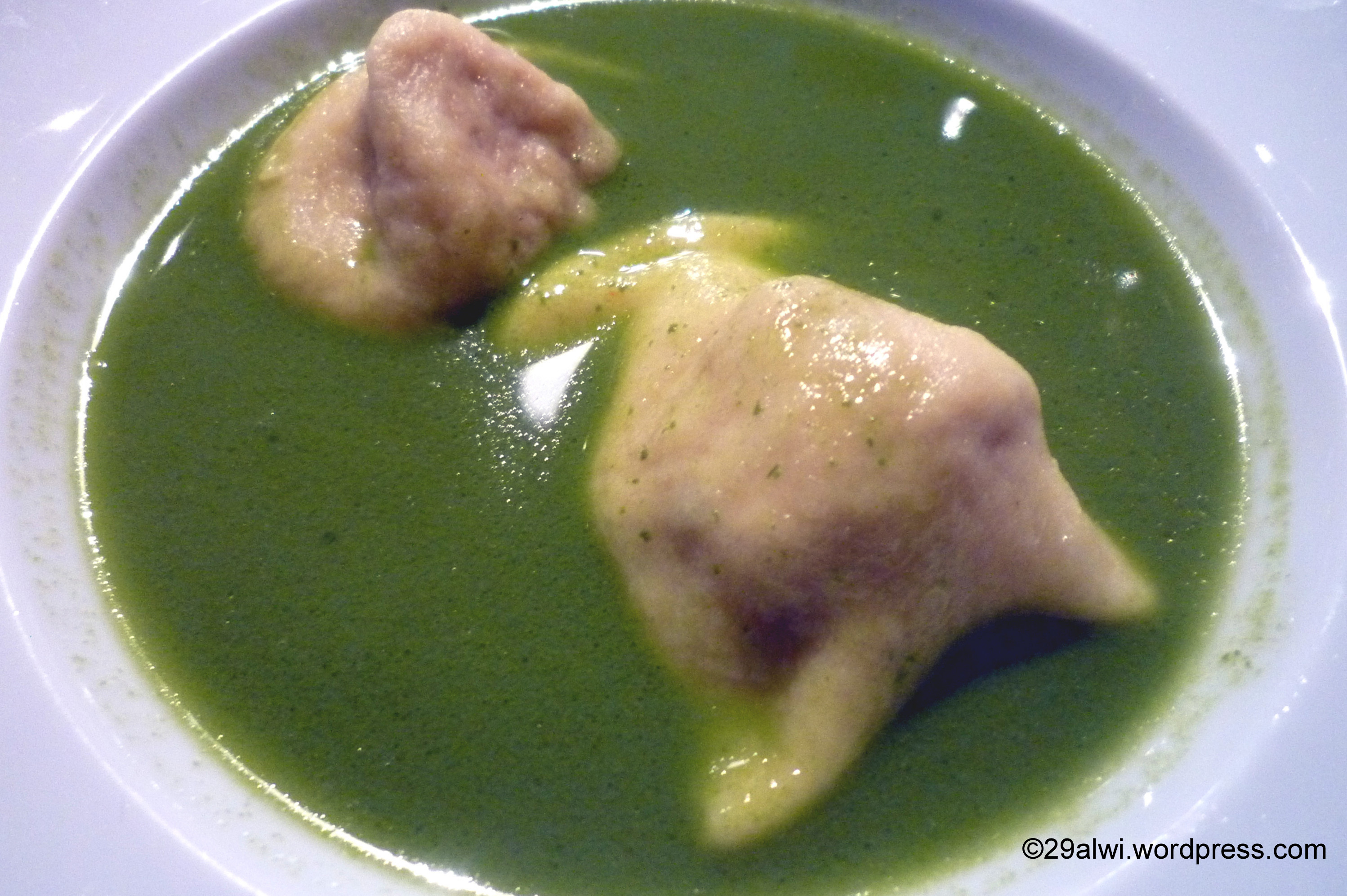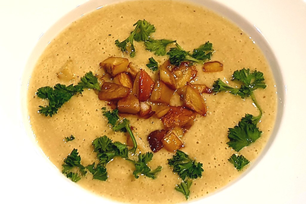 Öl in einem Topf erhitzen, Schalotten, Knoblauch und Ingwer bei mittlerer Hitze 2-3 Minuten dünsten. Danach die Kartoffeln und die gebratenen frischen Steinpilze dazugeben und weiter 2-3 Minuten dünsten. Die eingeweichten Steinpilze unterrühren und mit dem Wein ablöschen und stark einkochen lassen. Mit Gemüse- und dem Pilzfond sowie der Sahne auffüllen und offen 20-25 Minuten schwach kochen lassen, dabei mit Pfeffer und Chilipulver würzen. Die Suppe zusammen mit den 1/3 der frischen Pilzen in einer Küchenmaschine fein pürieren und durch ein Sieb streichen.
