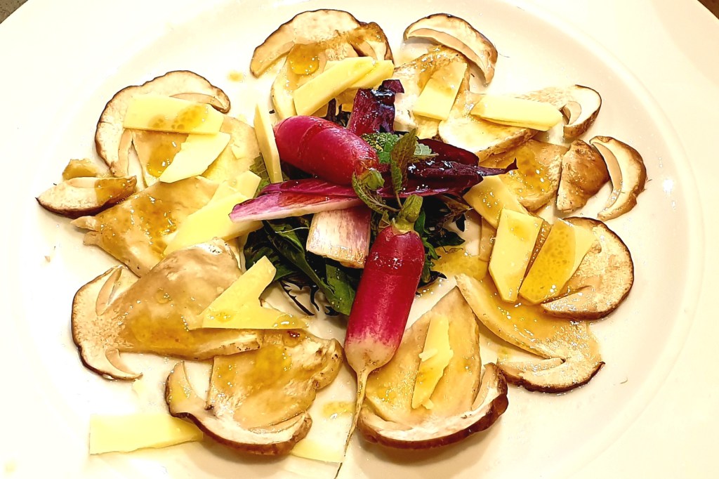 Voraussetzung sind völlig makellose, frische Steinpilze. Die Pilze gründlich säubern, mit Küchenpapier trockentupfen und eventuelle Schadstellen entfernen. Kein Wasser an die Pilze!!! Die Pilze in dünne Scheiben schneiden oder hobeln und auf Tellern anrichten. Leicht salzen und pfeffern, Bergkäse darüber hobeln und mit Olivenöl beträufeln, einige Minuten marinieren lassen. In der Mitte einen Salat anordnen.
