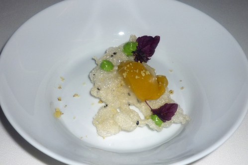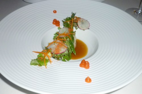 Der Salat bestand aus Jakobsmuschel, Pulpo Garnele. Der Ziegenkäse als Sorbet serviert, brachte Schmelz und Frische an das Gericht.
