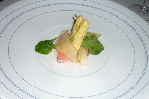 Die Hummerscheren mit grünen Spargel, Wildkräuter und Parmesan