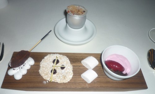 Zum Abschluss dann Kaffee, ein Mirabelle und der Desserthit des Essigbrätlein. Fünf verschiedene Schokoladen hergestellt aus Valrhona Couverturen u.a. mit Trauben, Himbeere und karamelisierten Nüssen.