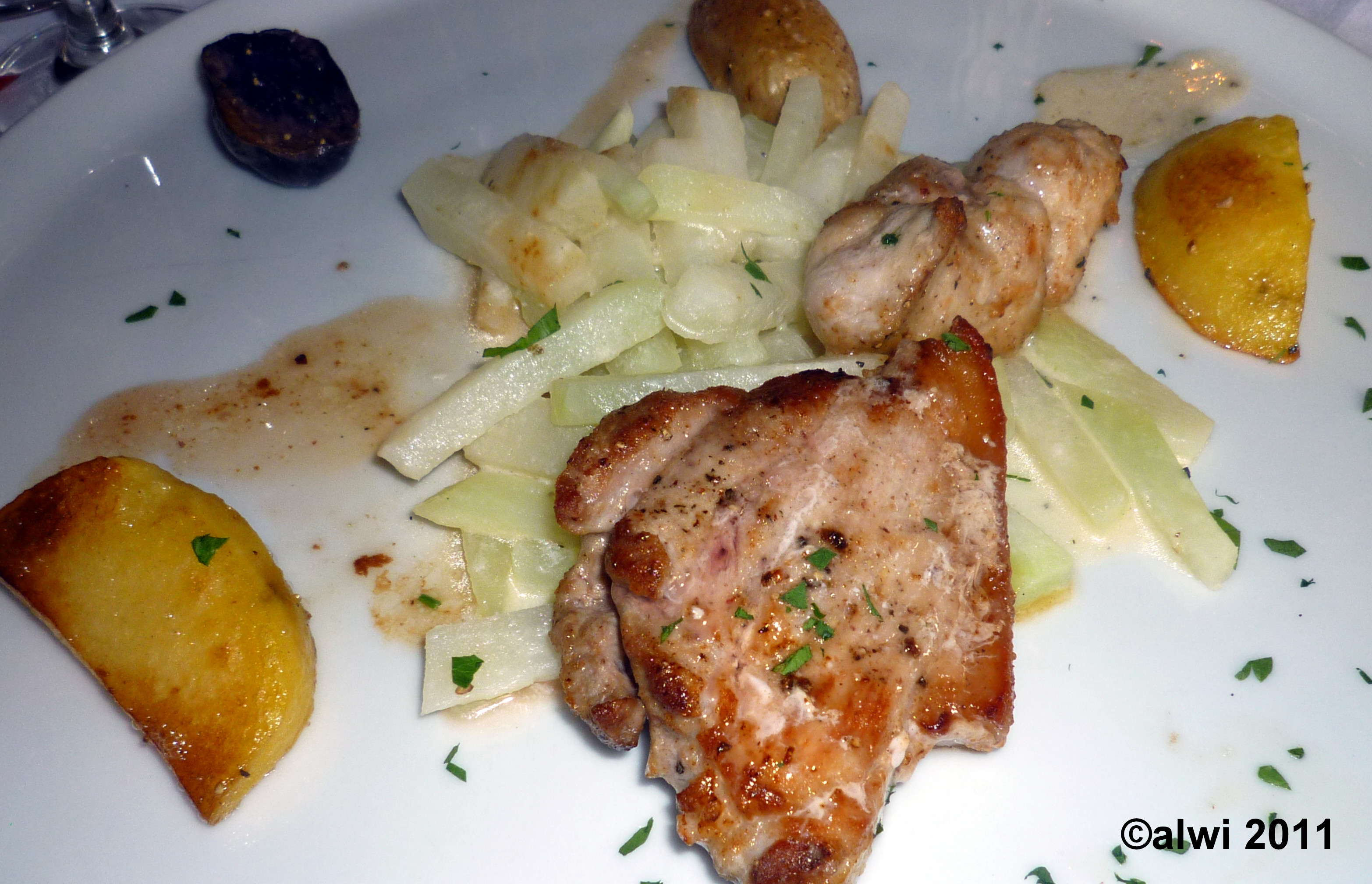 Die „Silberhaut“ stellte sich als Alufolie heraus. In dieser war der Fisch gegart worden. Bei dieser Garmethode bleibt der Fisch saftig. Beim Öffnen der Folie entströmte ein wunderbarer Geruch von Kräutern, Wein und Tomate. Das geschmorte Gemüse schmackhaft, aber ein wenig zu kalt.