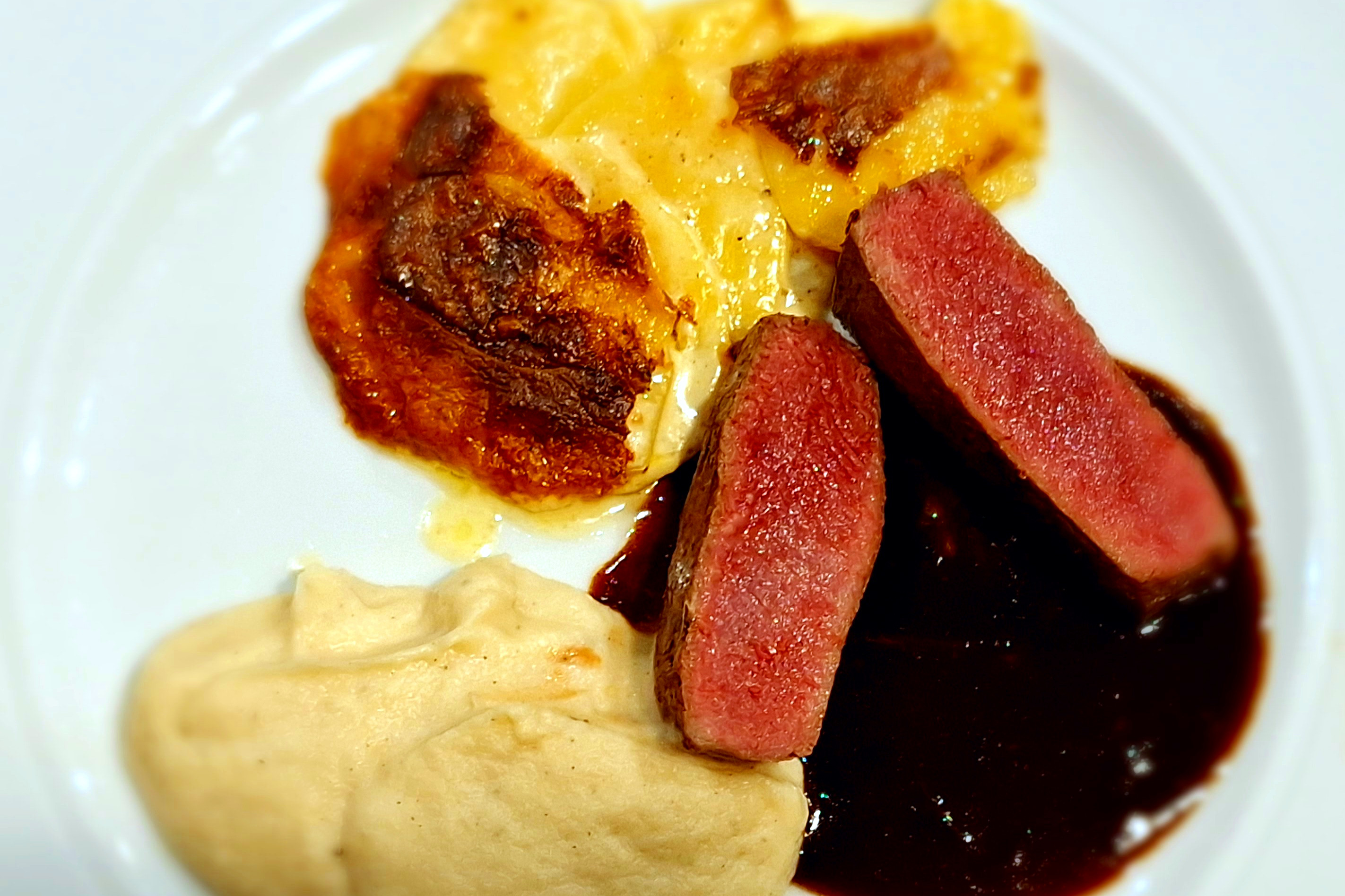 Wenn unsere Tochter Sabrina bei uns zum Weihnachtsessen kommt, muss es dieses Gericht geben. Rehrückenfilet, Selleriemousse, Kartoffelgratin, Rehsauce.