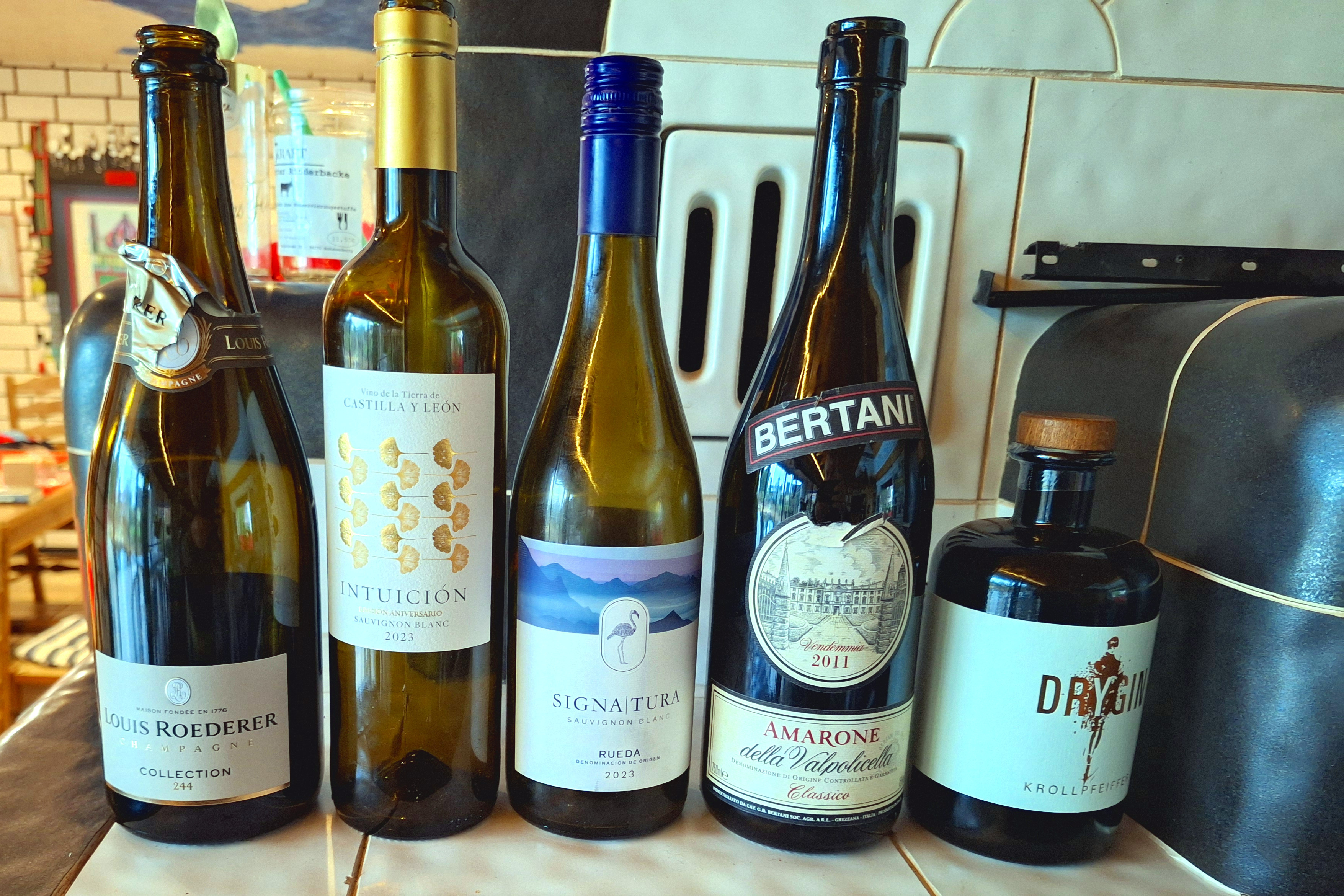Die Weine , eine kleine Reise durch Europa. Zum Auftakt Champagner aus Frankreich, danach leichte Weißweine aus Spanien, zum Reh dann einen gereiften Amarone aus Italien und zum Käse einen Gin, gereift im Calvadosfass aus Kassel