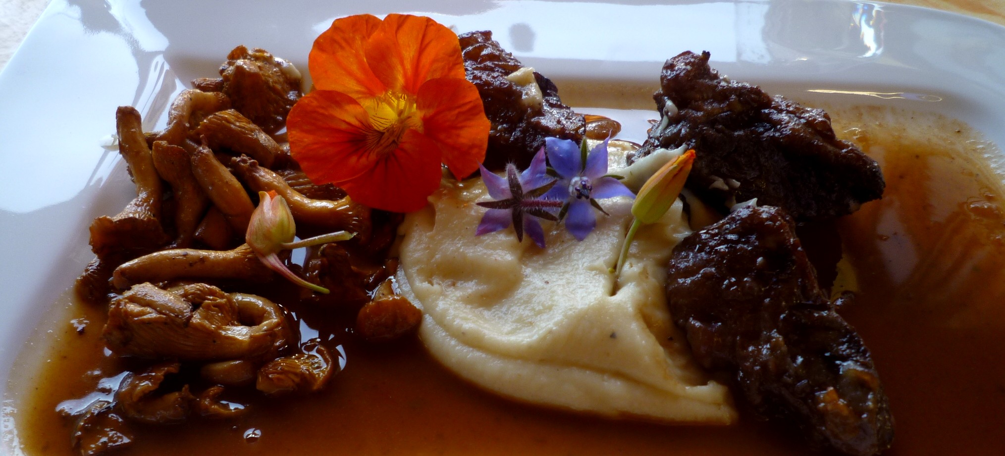 Auf einen vorgewärmten Teller das Püree verstreichen. Die Karotte dazulegen und mit bunten Salatblättern dekorieren. Die Brust in Scheiben schneiden und auf den Teller legen.