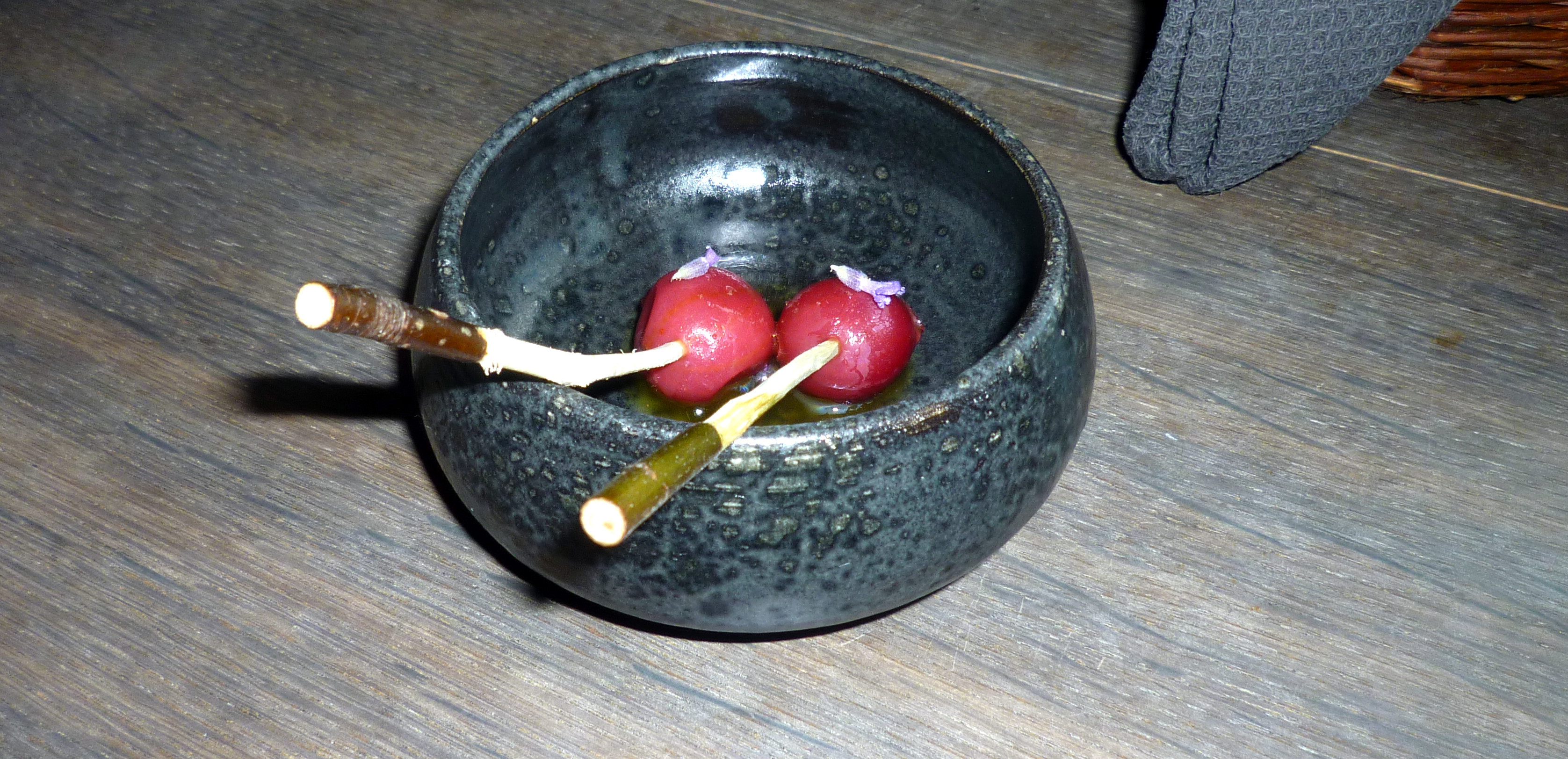 Kohlrabi oder auch „Ananas des Nordens“: Zuerst sieht man nur die ganze Knolle und man fragt sich, wie soll ich die zerlegen. Dann wird vom Service die Knolle herum gedreht, man sieht eine kleine Öffnung und ein Strohhalm ragt heraus.Im Inneren befindet sich ein Gemüsesaft mit Kohlrabi als Basis, dazu kommen weitere Aromen, die ich aber nicht genau definieren kann.Zusätzlich gibt es ein Kräuterbündel. Dieses ist mit einer Vinaigrette überzogen. Beim hinein beißen kommen die verschiedenen Kräuter unmittelbar zur Geltung.