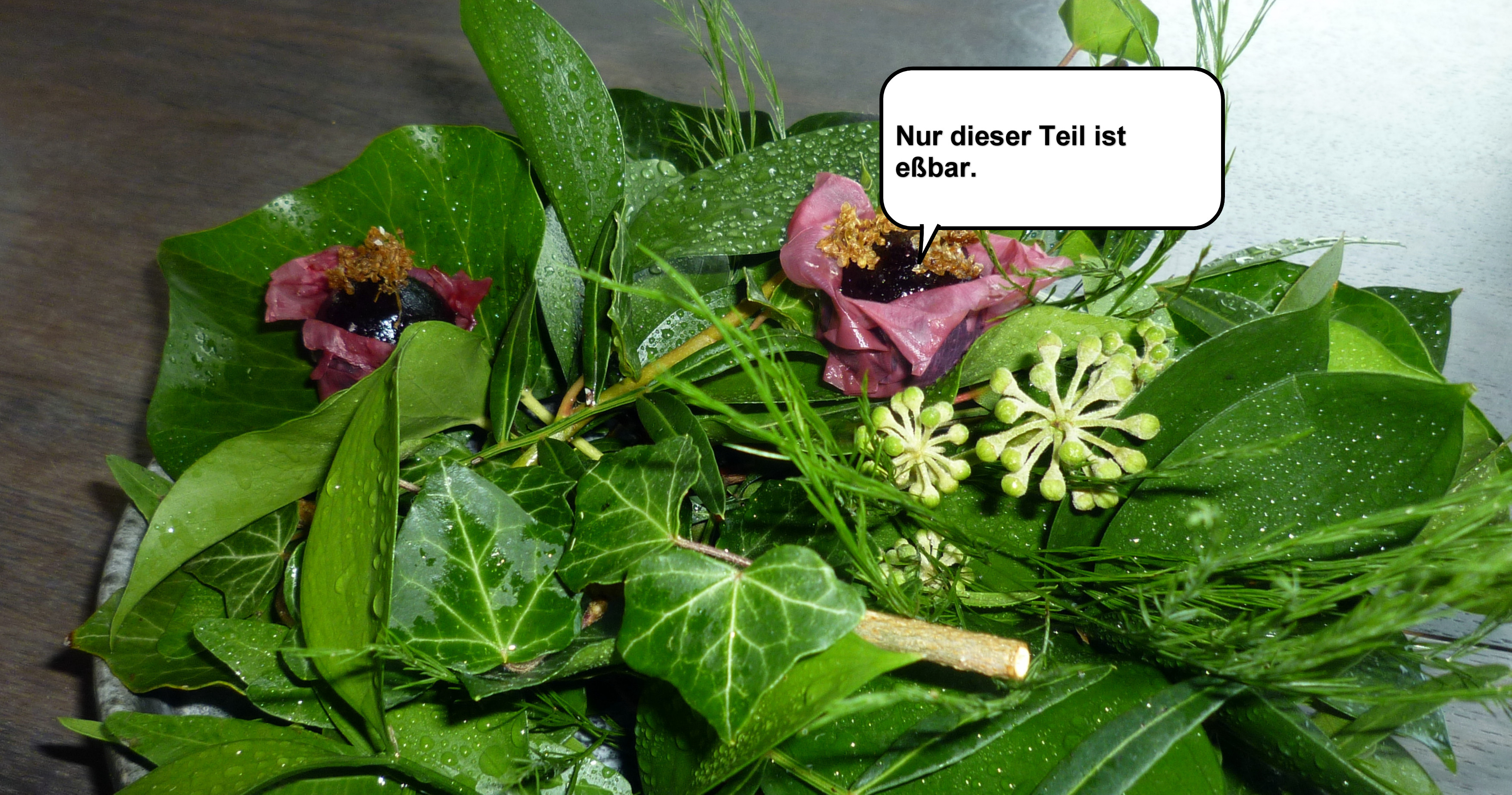Schwarze Johannisbeere und Rose: Man kann die Dekoration auch übertreiben. 9/10 Dekoration, 1/10 Essbar. Eigentlich sollte alles was auf den Teller kommt auch essbar sein. Essbar waren lediglich drei zusammengefaltete Rosenblätter gefüllt mit einer frischen schwarzen Johannisbeere und getrockneten Beeren. Interessent dabei die intensive Geschmacksvielfalt bei frisch und getrockneten Beeren. Wie so oft bringt die getrocknete Form mehr Geschmack.