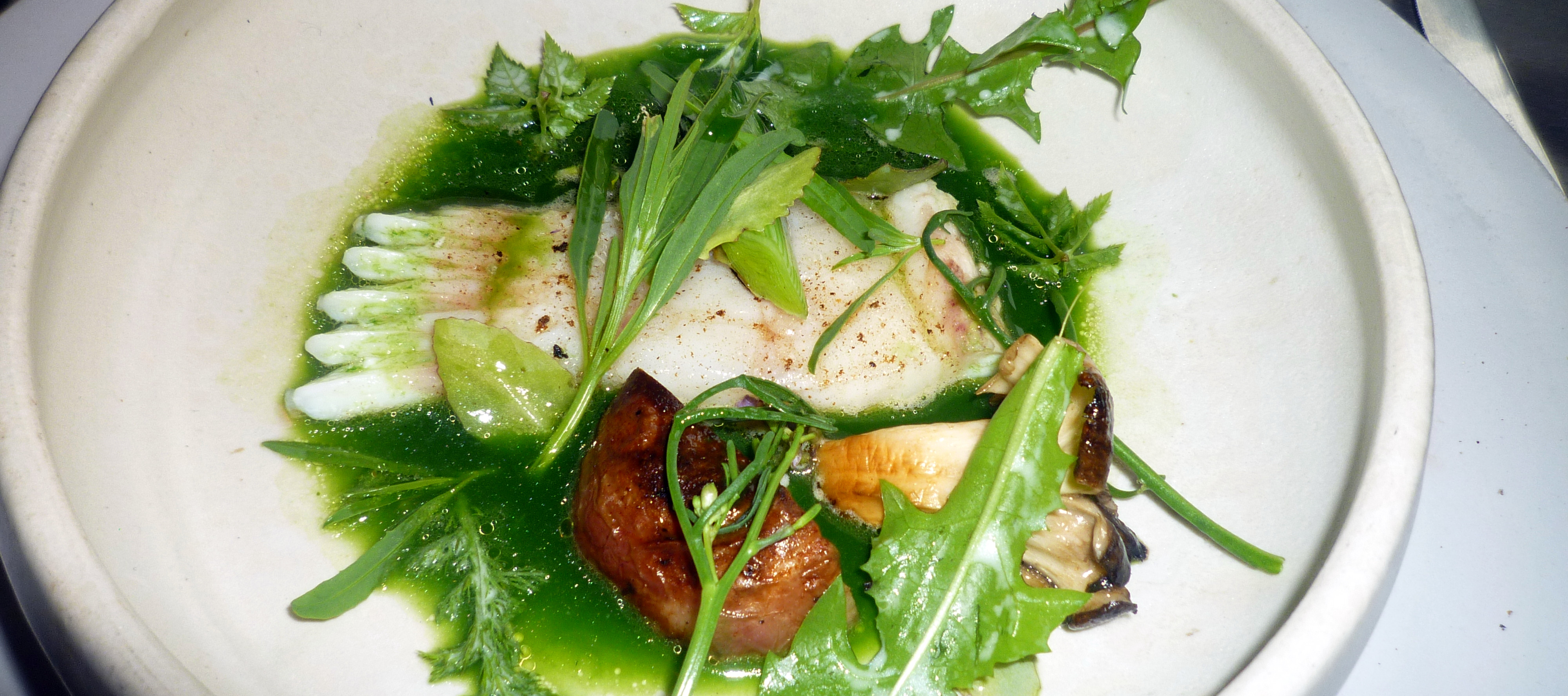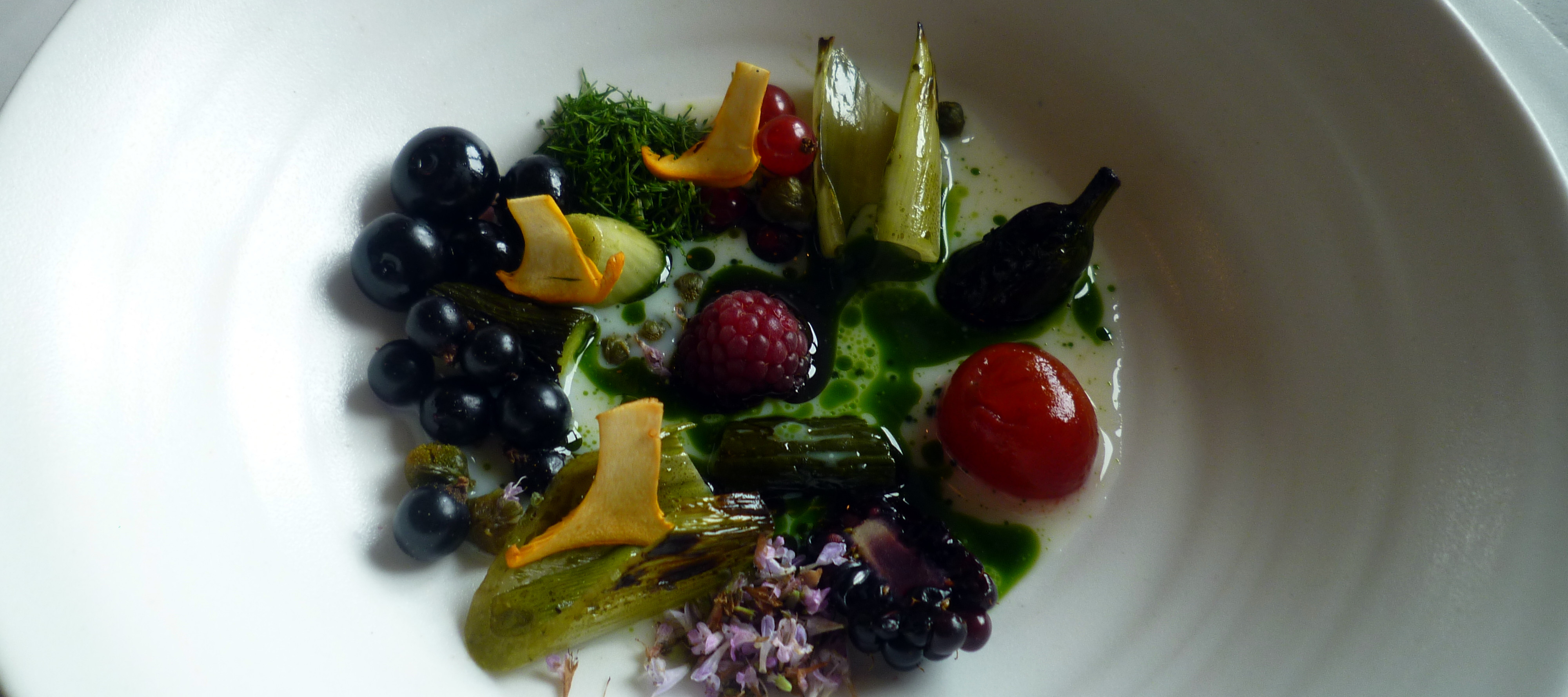 Beeren und gegrilltes Gemüse: René Redzepi liebt Röstaromen. Zu den frischen ansonsten unbehandelten Früchten gab es Gemüse (Lauch, Pilze) die wieder ein leichtes Röstaroma aufwiesen. Dazu Kräuter und Blüten sowie eine Kräutersauce auf Ölbasis.