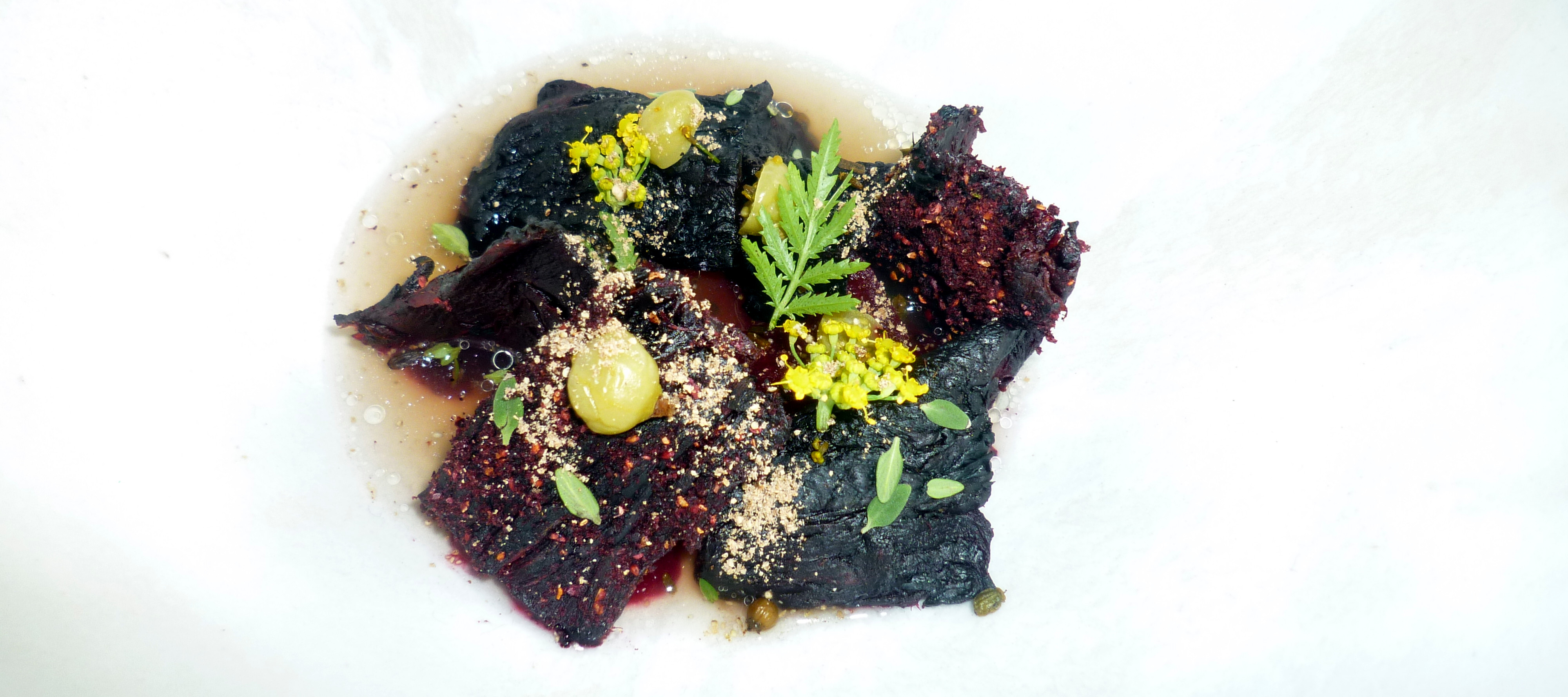 Rote Beete und aromatischen Kräutern: Beim ersten Blick hatte ich das Gefühl, endlich kommt ein Stück Fleisch, sehr dünn wohl aber halt Fleisch. Nein, kein Fleisch sondern dünne Scheiben von der Roten Beete, unterschiedlich lang gegart und getrocknet. Dazu eine große Anzahl von Kräutern und Blüten.