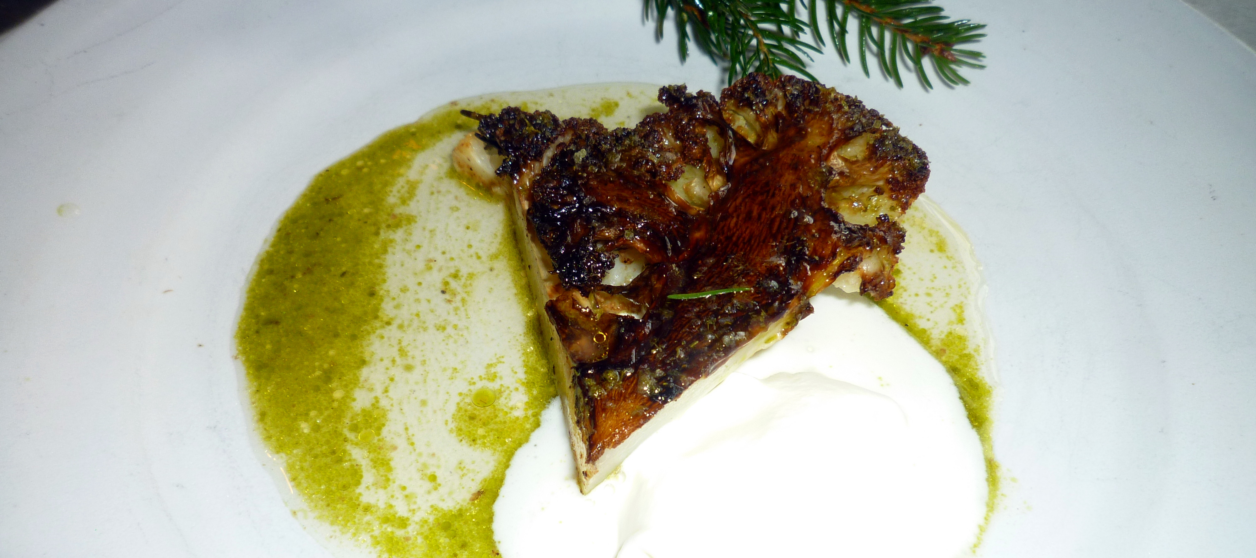 Blumenkohl und Pinien, Sahne, Meerrettich: Wieder gab es was „angebranntes“. Ein Stück Blumenkohl sehr stark geröstet, abgedeckt mit Fichtennadeln (nicht essbar), ein leicht säuerlichen Piniensud und milde Meerrettich Sahne.