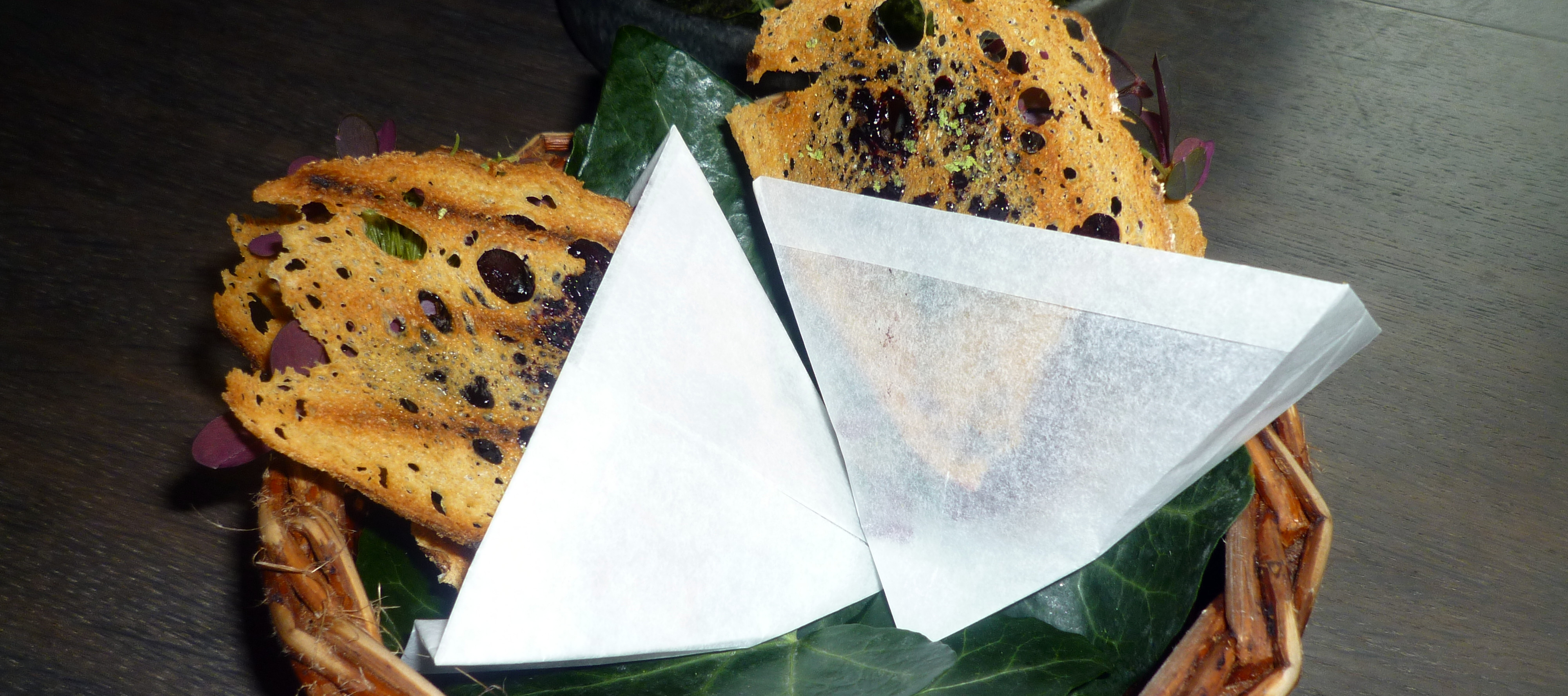 Brot mit gegrillten Rosen: In sehr kurzen Abständen werden die einzelnen Gerichte auf den Tisch gestellt. Weiter geht es mit Brot und Rosen. Beides mit sehr starker Leistung. Das Brot ist fast schwarz, man könnte auch sagen es ist verbrannt. Auf dem Brot liegen die kurz angerösteten Rosenblätter mit einem sehr intensiven Aroma.