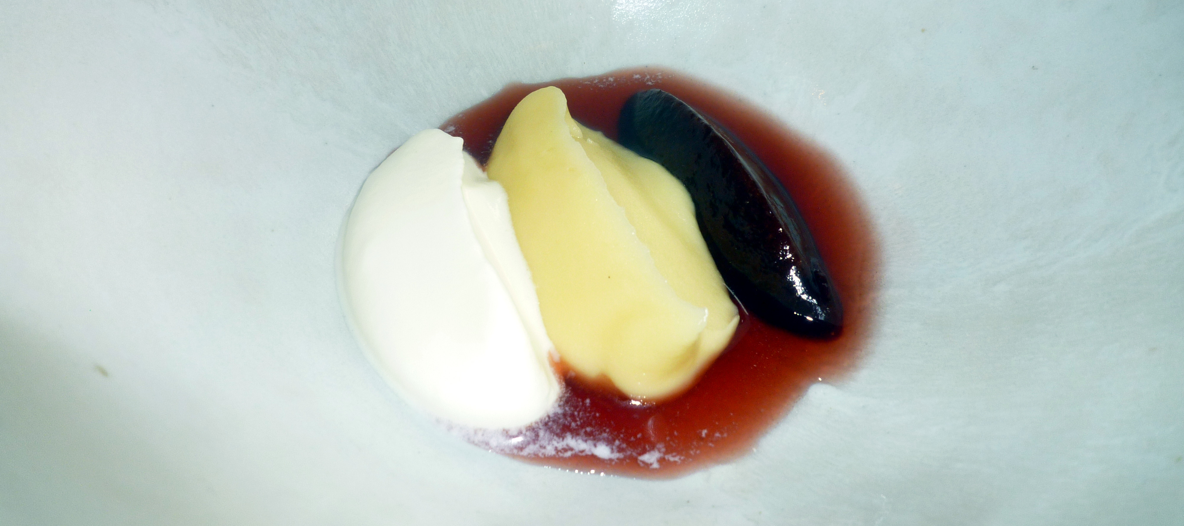 Kartoffel und Pflaume: Süßes Kartoffelpüree, eine an Bittermandeln schmeckende Sahne und eine Pflaume mit starken Aquavit Geschmack.