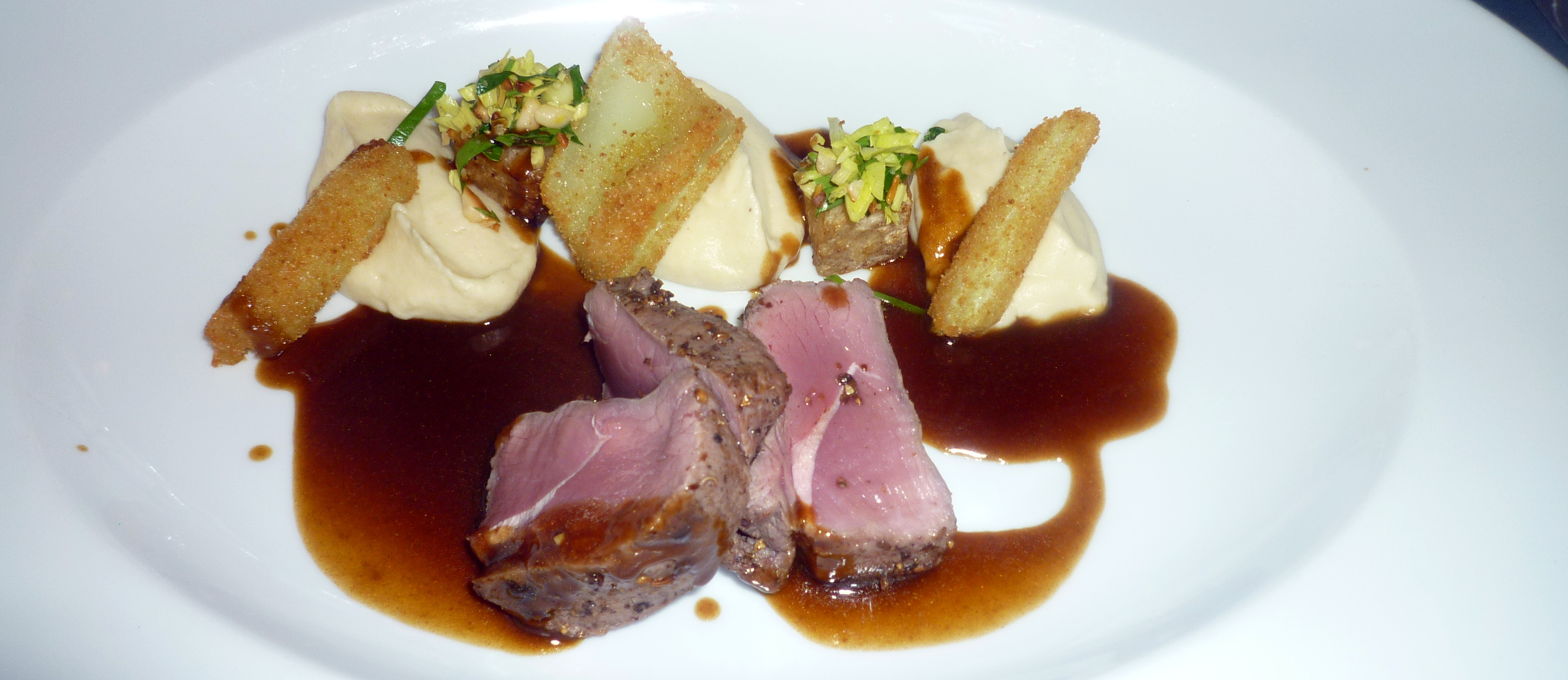 Das danach aufgetragene Menü war eigentlich ohne Fehl und Tadel. Lediglich der Schweinebauch hätte etwas krosser sein können. Sehr intensive und wohl schmeckend dafür das Sorbet von Liebstöckel. Ein Kunstwerk für sich war die Kugel aus weißer Schokolade mit Erdbeerfüllung.