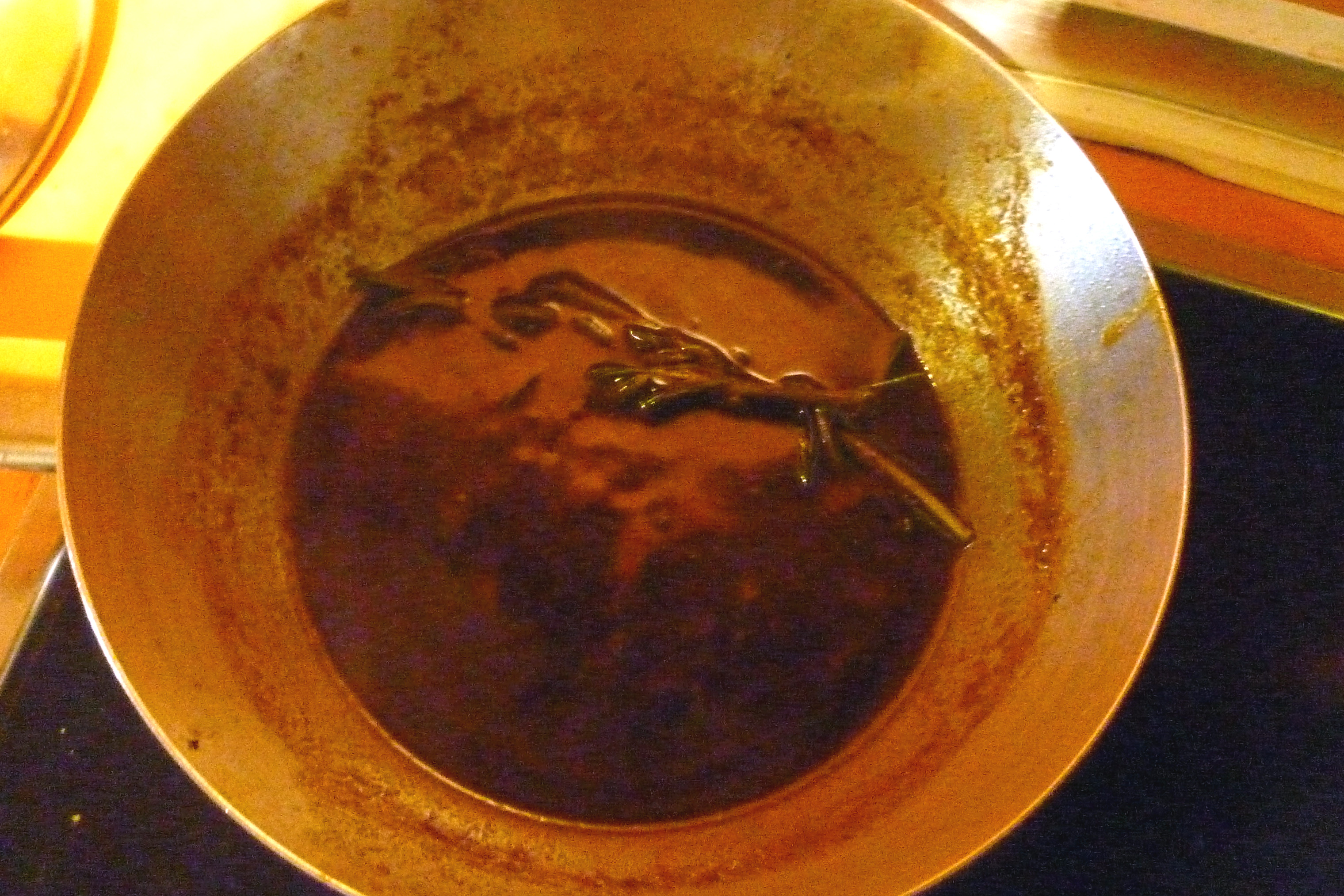 Diesmal nicht im Ganzen, sondern die einzelnen Blätter werden serviert. Dazu wird das untere Ende vom Rosenkohl abgeschnitten, die äußeren Blätter werden entsorgt. Die sauberen Blätter abzupfen und in einem Sieb sammeln. In einer Pfanne wird Honig und Butter zerlassen, die gewaschenen Blätter dazugeben und mit etwas Orangensaft ablöschen. Gewürzt wird mit Vanille und Curry sowie etwas Salz. Orangenfilets dazugeben. Die Blätter sollten noch Biss haben.