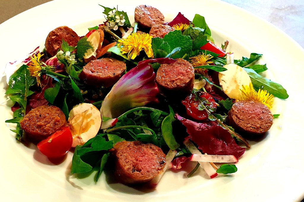 Die Brust aus der Folie nehmen und in Butter ca. 3 Min. überglänzen. Aufschneiden und mit Salat wie Radicchio, Feldsalat, Rauke und Chicoree anrichten. Der Salat wurde mit einem Apfel Balsam Essig von Ziegler sowie Kürbiskernöl gewürzt