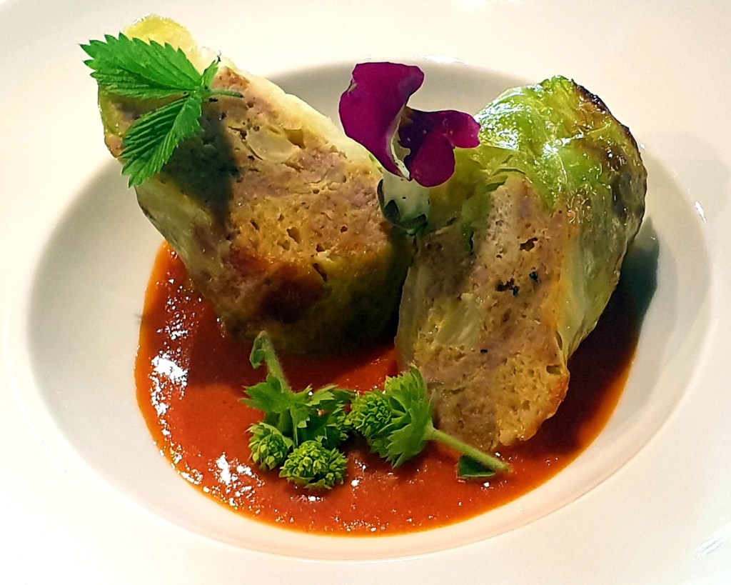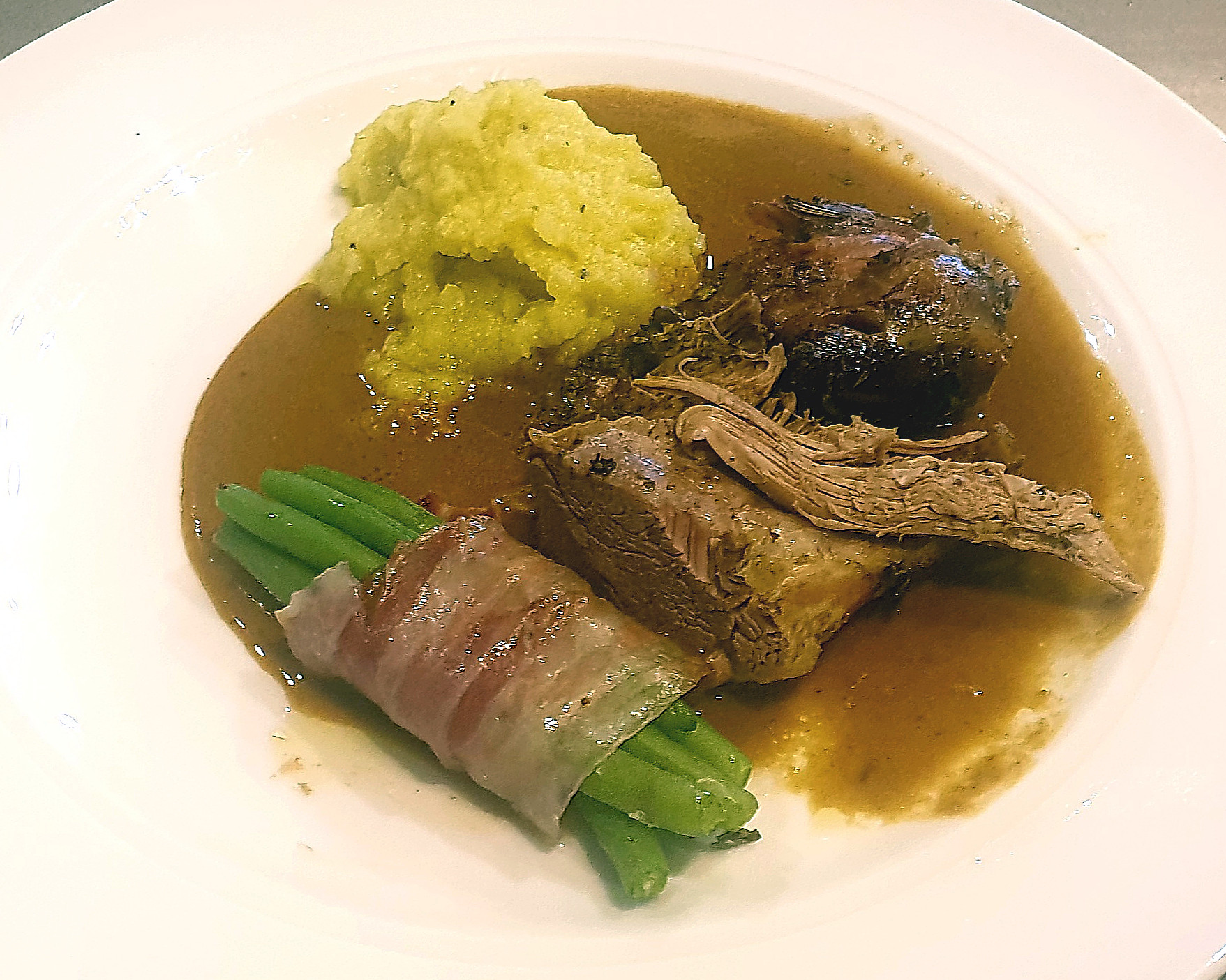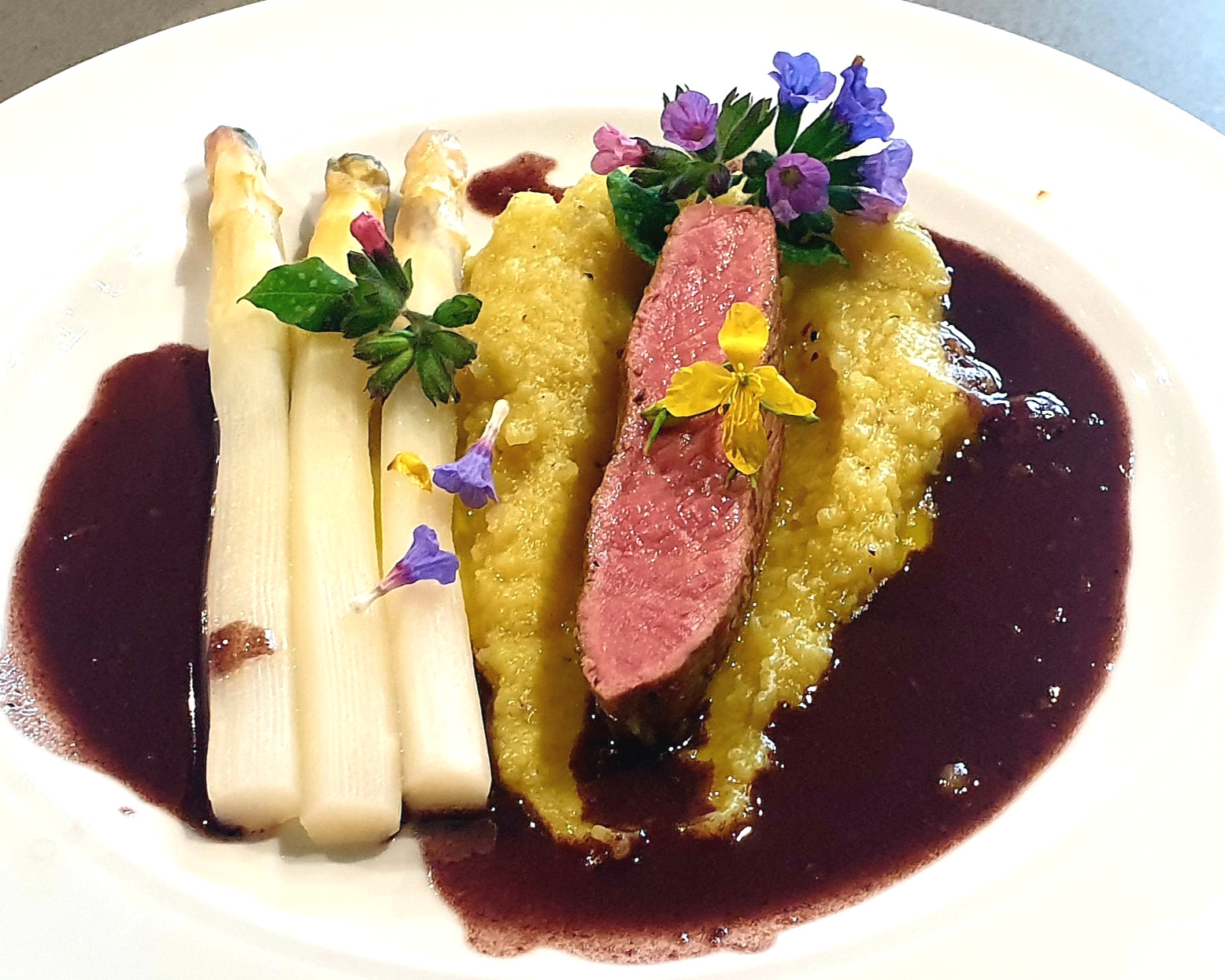 Zickleinrücken, Spargel, Brokkoli, Kartoffelgratin, Buttersauce