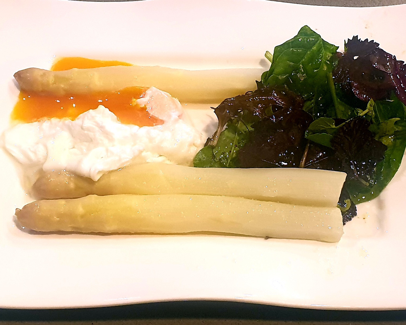 Der erste Spargel der Saison mit Lachs und grüner Soße. Bei der Kräutermischung war ein Kraut dabei, dass die Soße nicht so leuchtend grün machte wie am Samstagmittag