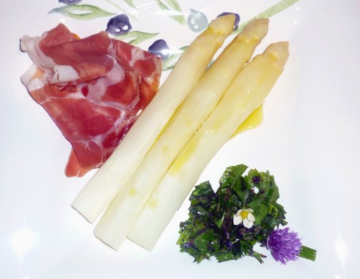 Auf dem Markt gab es den ersten Spargel aus deutschem Anbaugebiet. Panierte (mit Giersch) kleine Schnitzel aus dem Kotelettstrang vom schwäbisch hallischen Schwein und neue Kartoffeln.