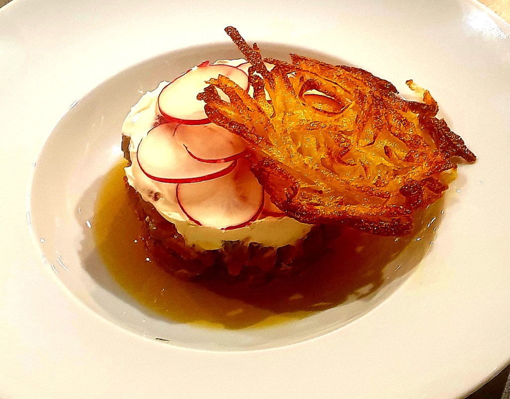 Ein klassisches Kartoffelpüree herstellen und dabei mit Muskat kräftig würzen.