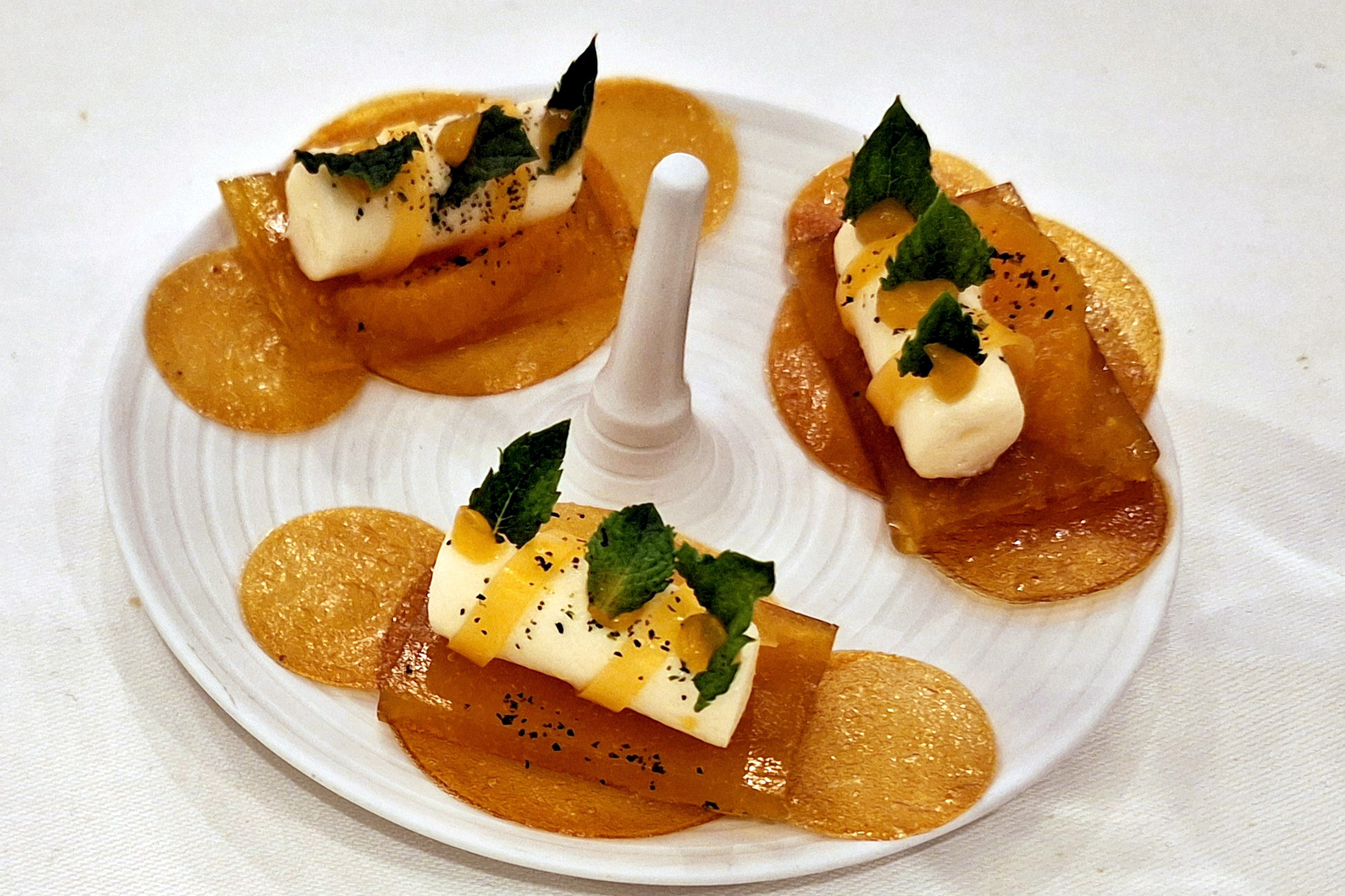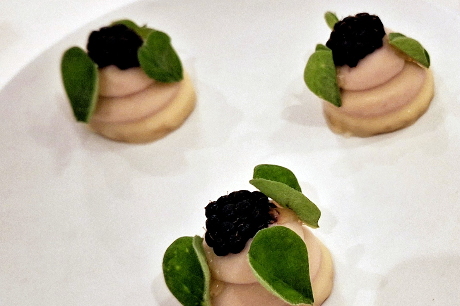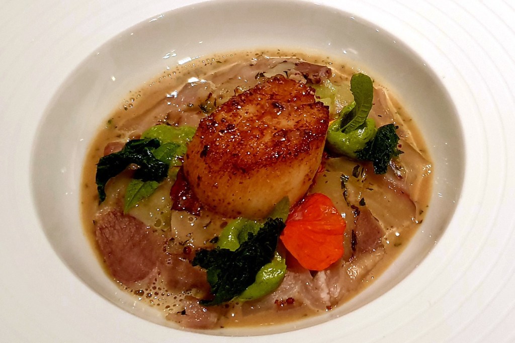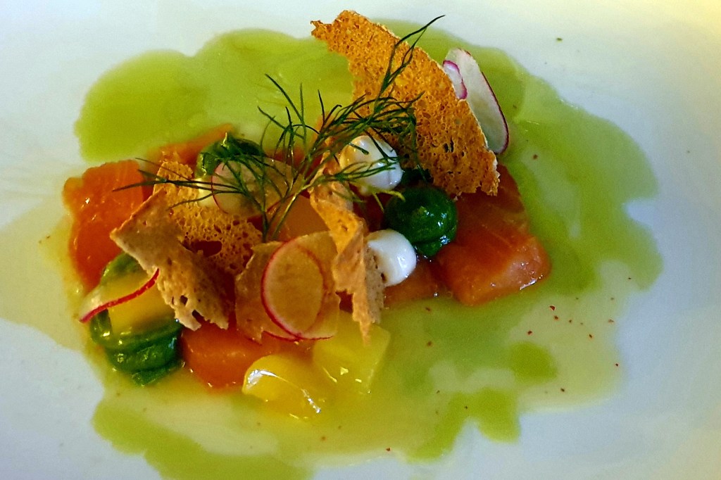 1. Gang: Eine elegante Komposition: Erbsencreme als Basis in der Muschel, darauf Hummertatar und kurz angebratene Jakobsmuscheln. Daneben saftige Melonenstücke, Minzejoghurt für Frische und Säure, dazu knuspriger, salziger Bacon.