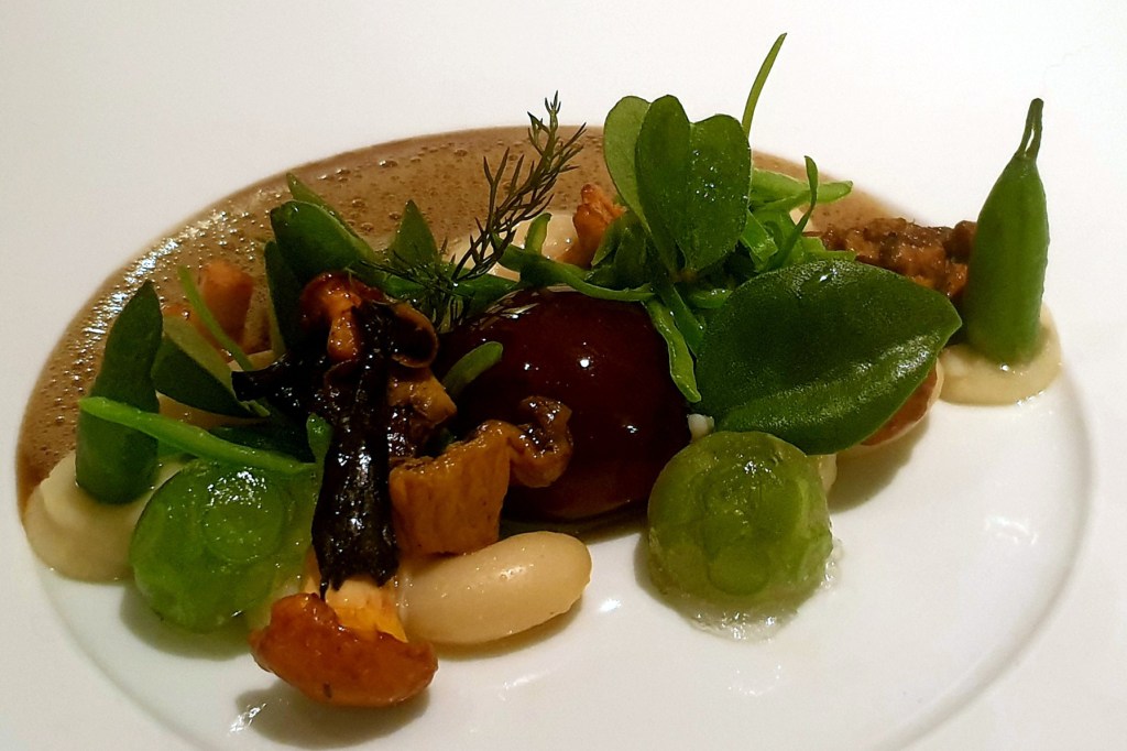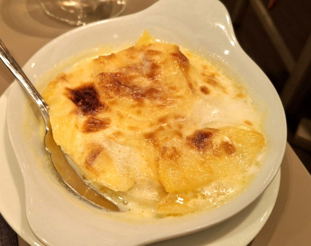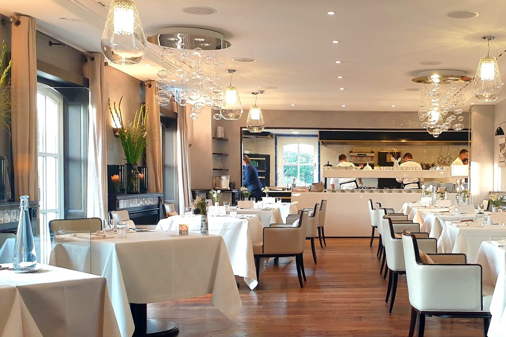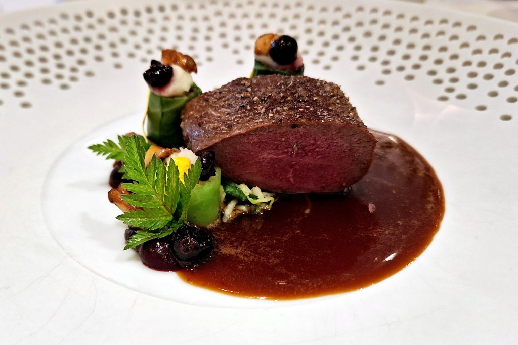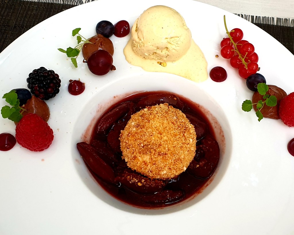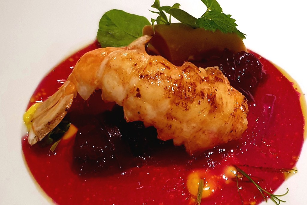 Die Kellner arbeiten aufmerksam und nehmen sich Zeit für unsere Wünsche – Beschwerden gab es nie. 2021 erlebten wir allerdings eine Ausnahme. Umso erfreulicher, dass die bestellte Karaffe 2022 Sauvignon Blanc „Austernfischer“ vom Weingut Hofmann perfekt gekühlt auf dem Tisch stand. Der frisch servierte Wein mit seiner besonderen Note harmonierte wunderbar mit den ersten Gängen. Als Rotwein wählte ich eine Flasche 2019 vom Weingut Fürst aus Franken. Das Cuvée duftete nach roten Beeren, Karamell und Schokolade, am Gaumen frisch und fruchtig.