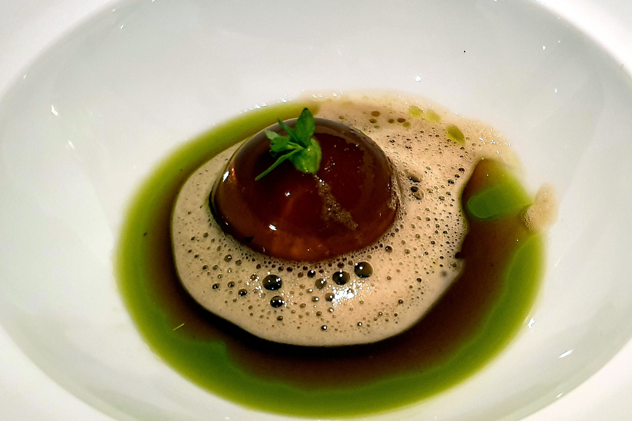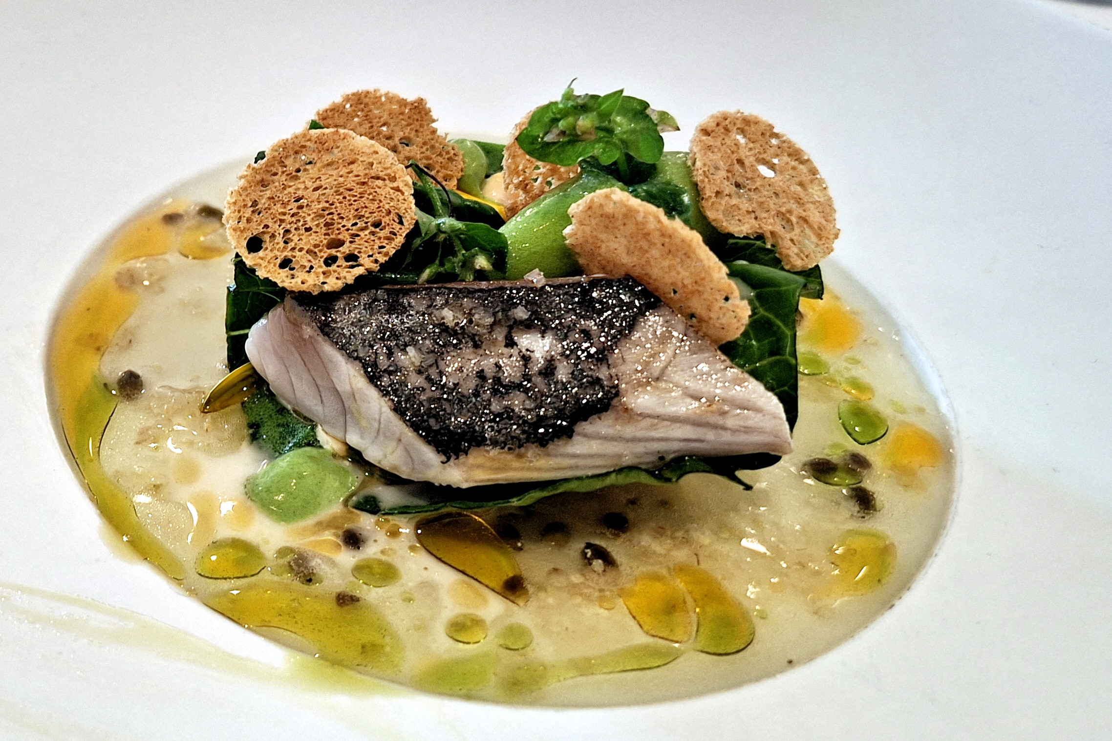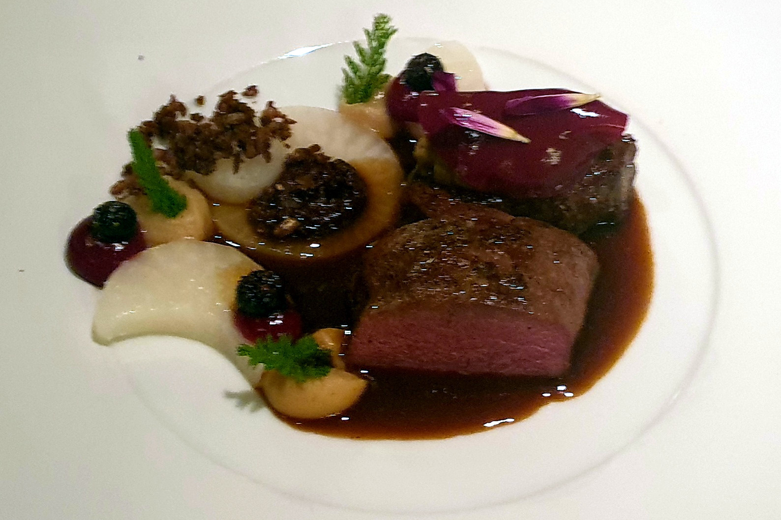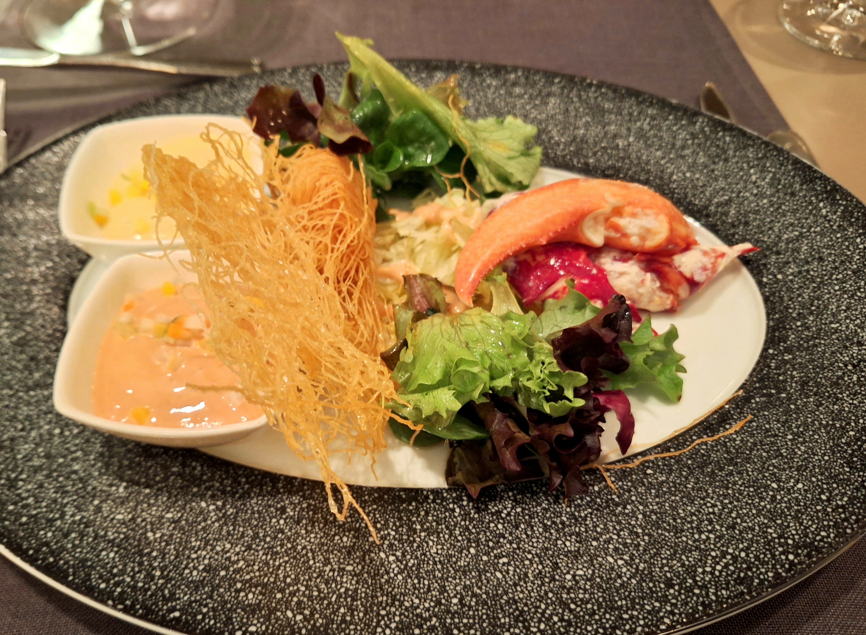 Zum frischen Brot mit Dips tranken wir Champagner und bzw. „Hugo“. Bei den Vorspeisen probierten wir uns quer durch die Karte, doch beim Hauptgang war die Ente unser Favorit. Nach etwa 20 Minuten kamen die Vorspeisen – das Warten lohnte sich. Die kreative Präsentation und die Frische der Gerichte begeisterten uns.