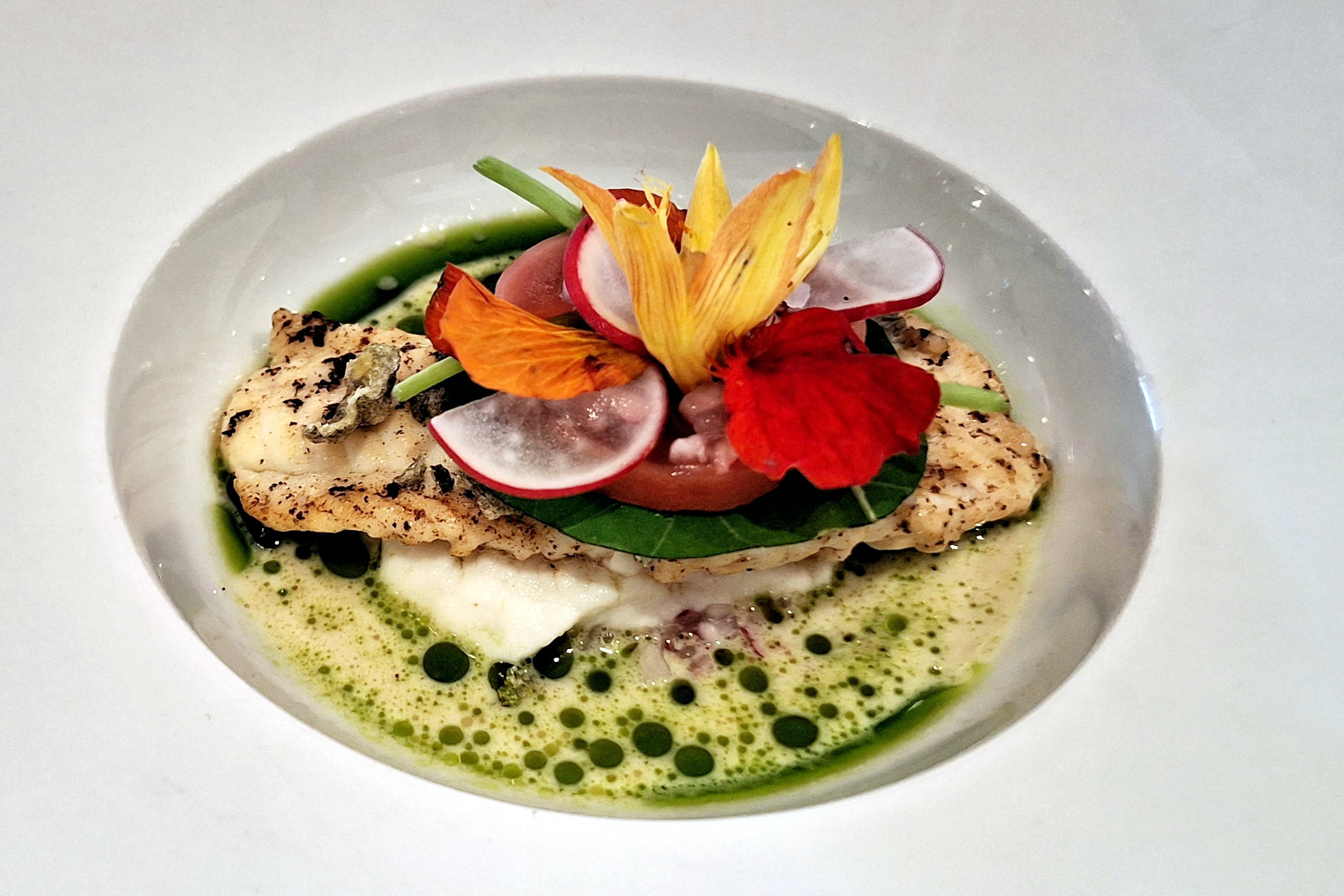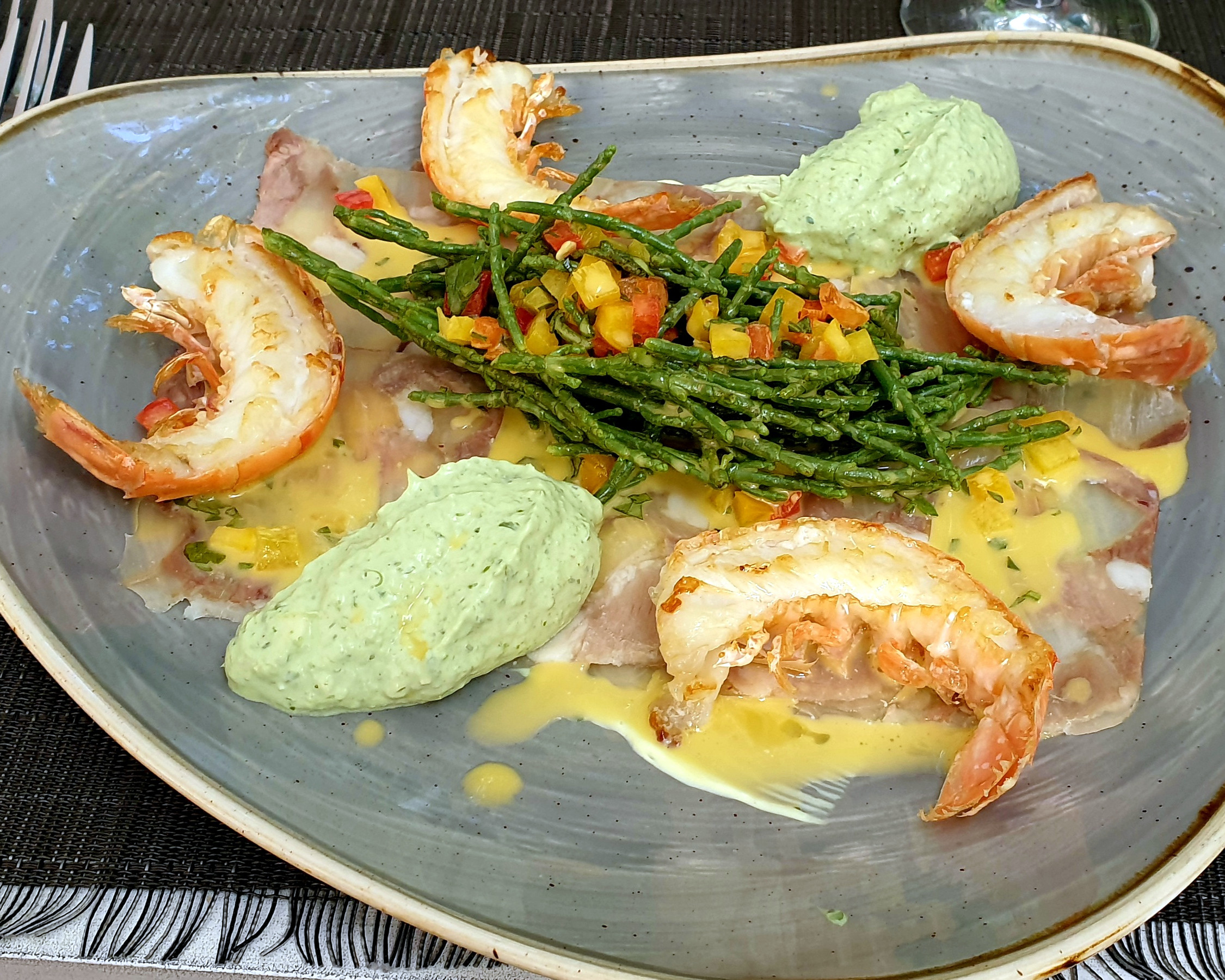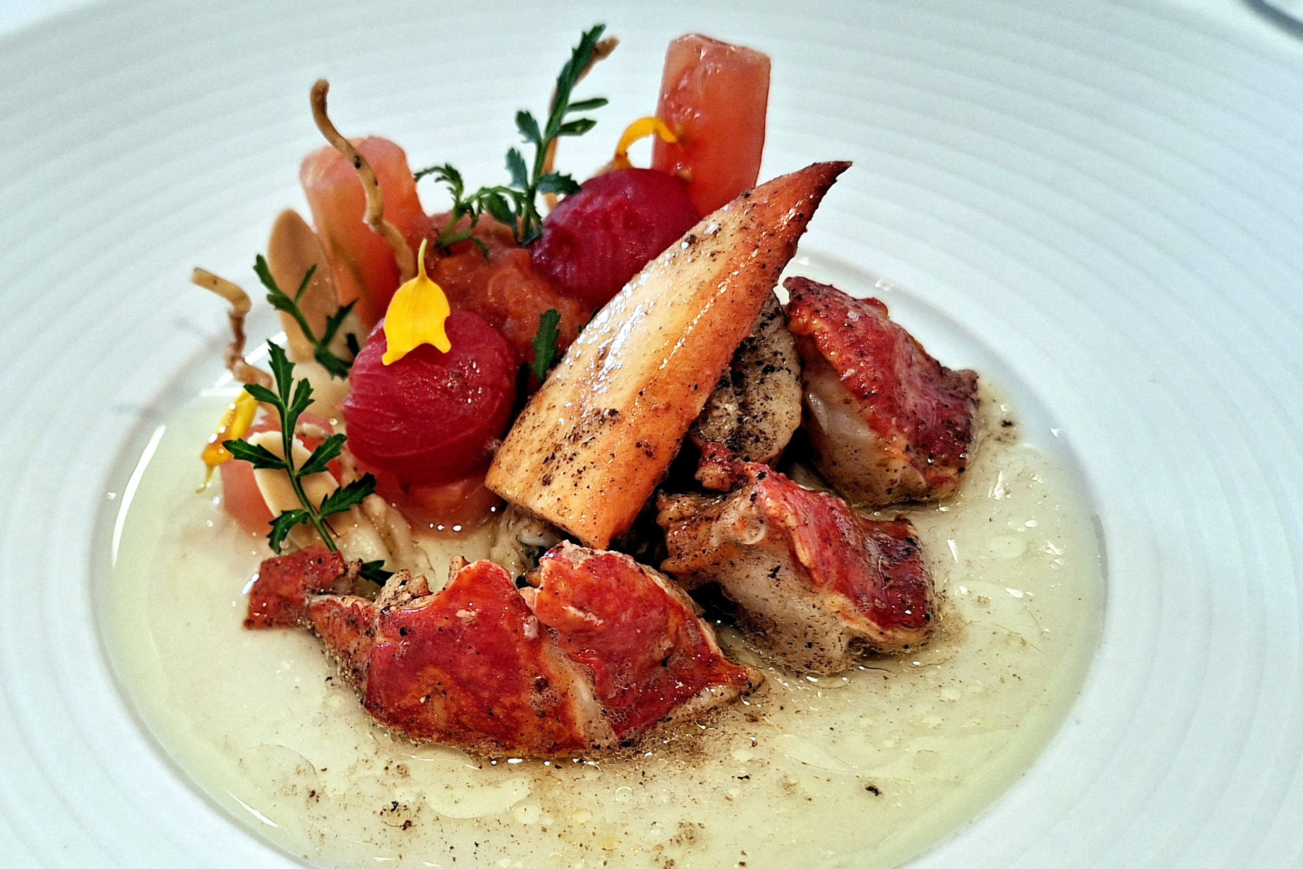 1. Gang: Eine elegante Komposition: Erbsencreme als Basis in der Muschel, darauf Hummertatar und kurz angebratene Jakobsmuscheln. Daneben saftige Melonenstücke, Minzejoghurt für Frische und Säure, dazu knuspriger, salziger Bacon.