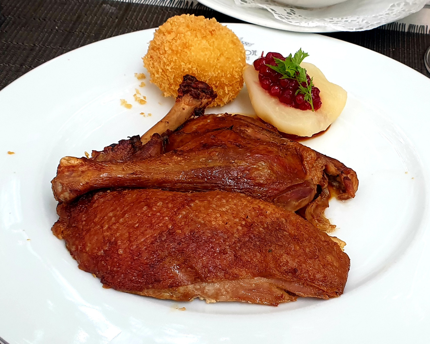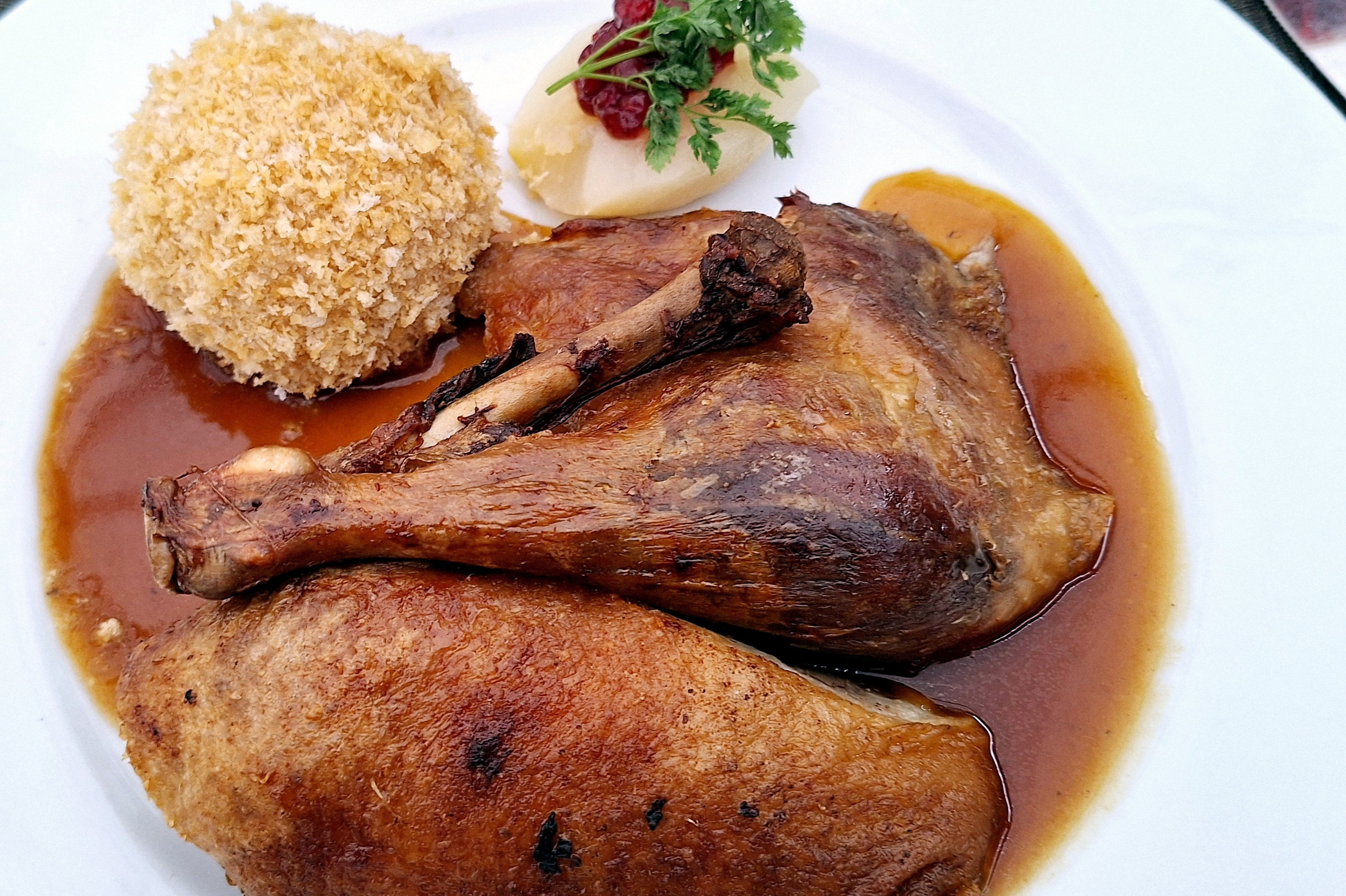 2. Gang: Die klassische ½ Vogelkojen-Ente mit Rotkohl, Kartoffelkloß, Preiselbeerbirne und Entensauce.