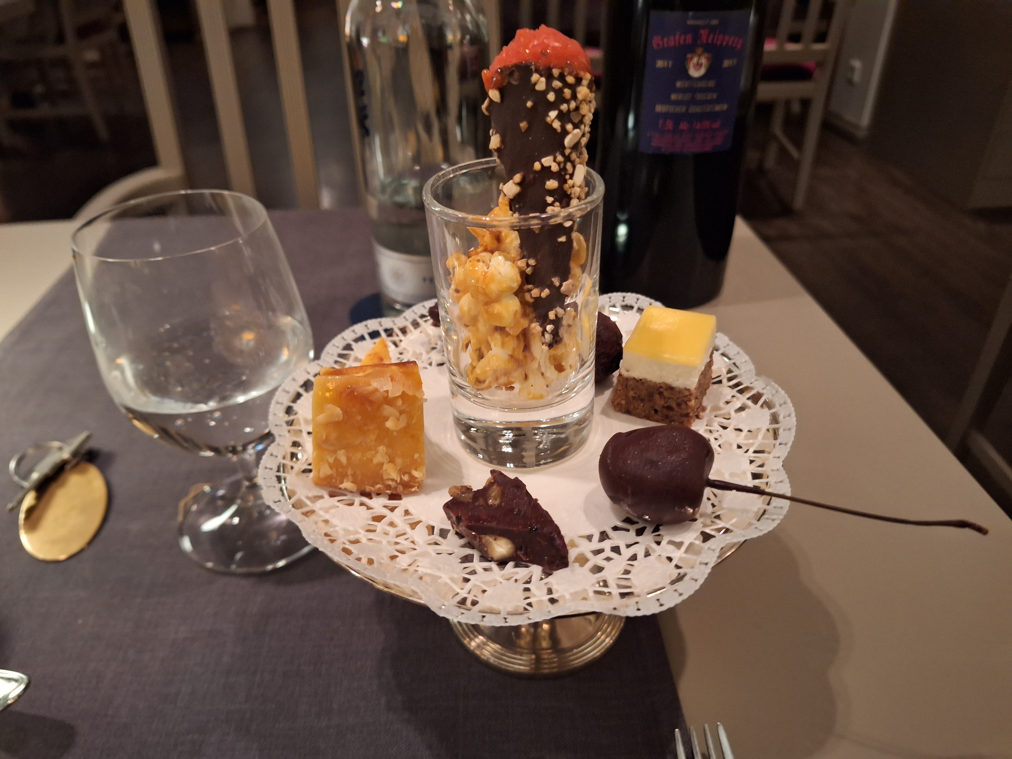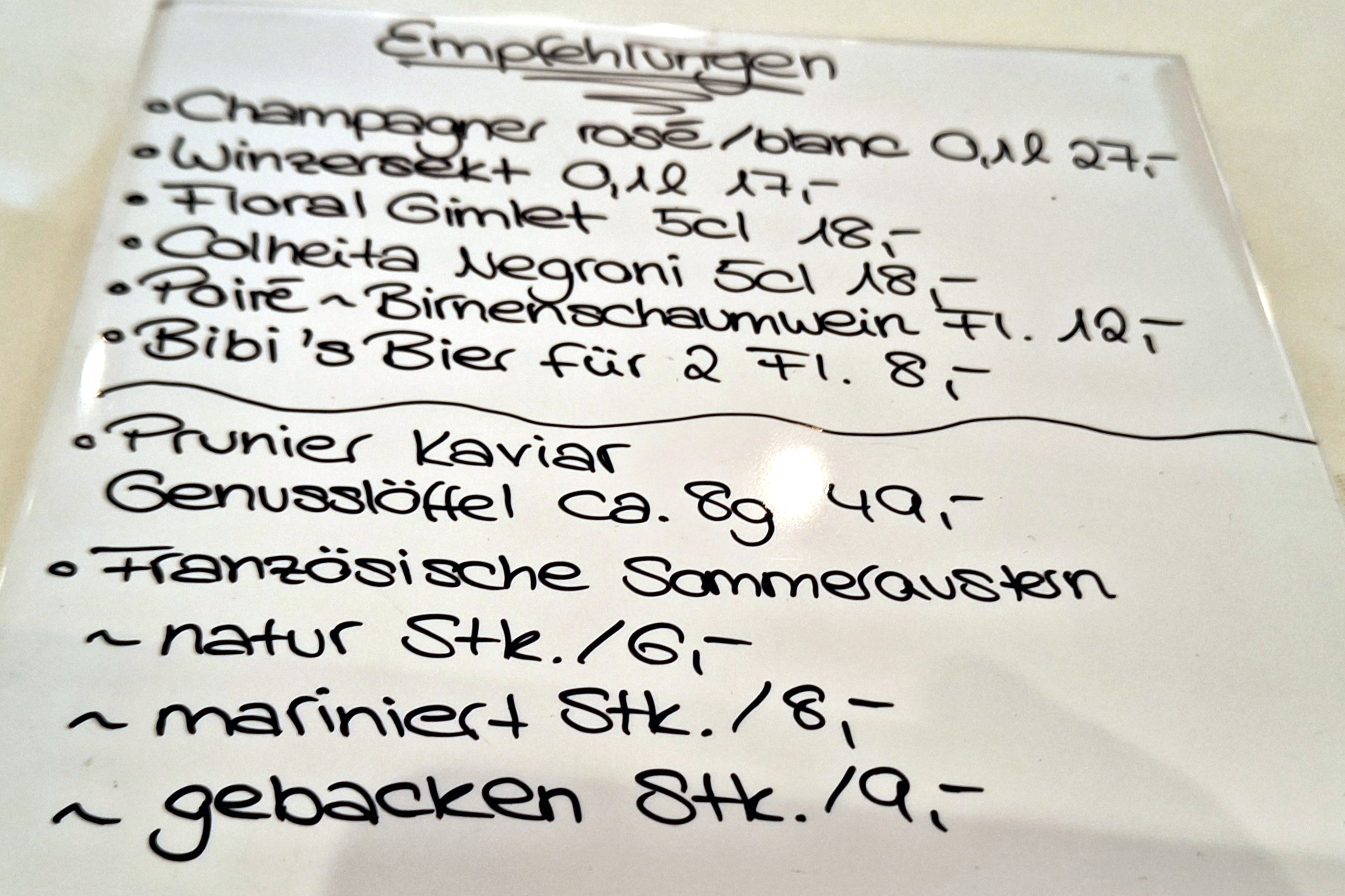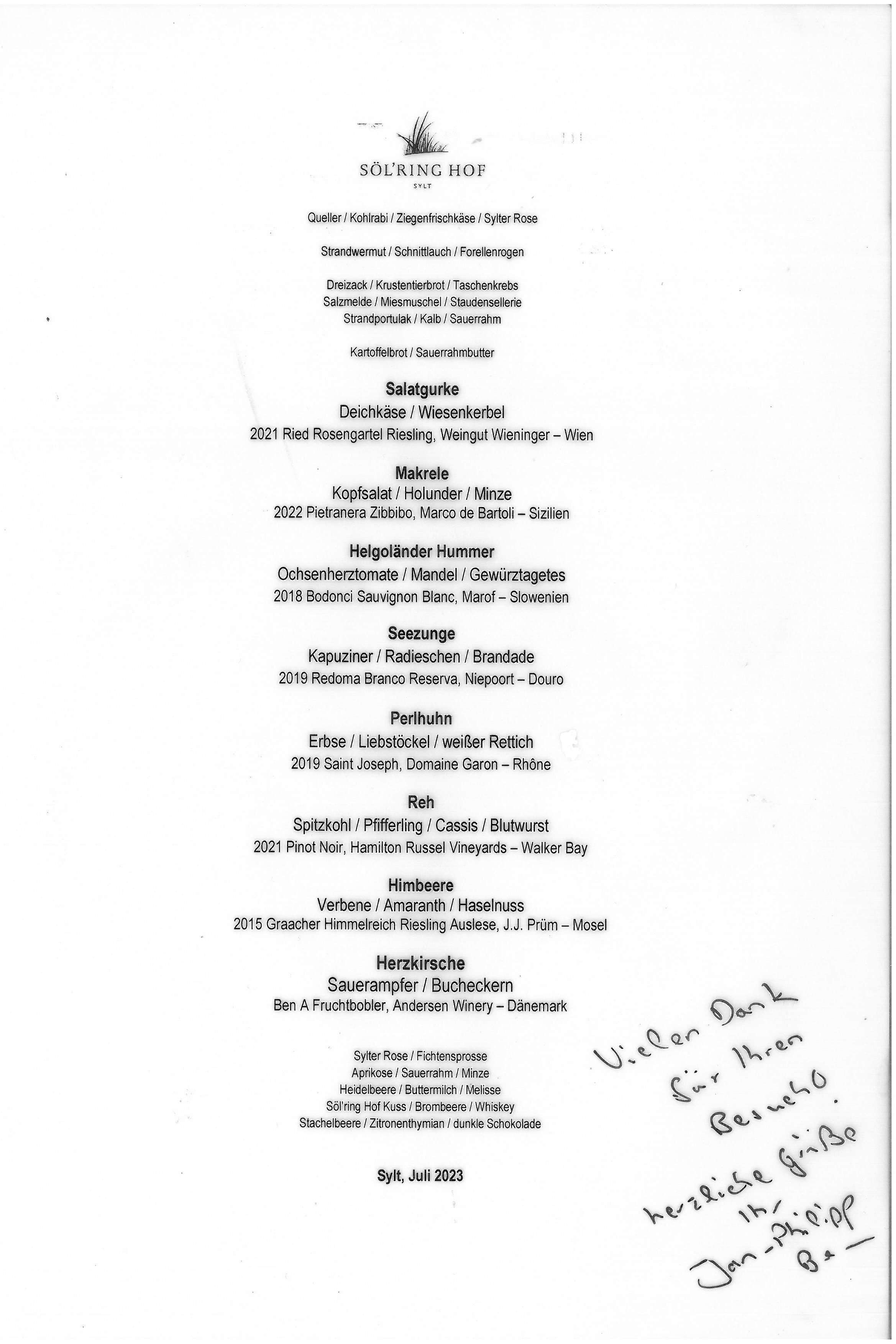 Die Kellner arbeiten aufmerksam und nehmen sich Zeit für unsere Wünsche – Beschwerden gab es nie. 2021 erlebten wir allerdings eine Ausnahme. Umso erfreulicher, dass die bestellte Karaffe 2022 Sauvignon Blanc „Austernfischer“ vom Weingut Hofmann perfekt gekühlt auf dem Tisch stand. Der frisch servierte Wein mit seiner besonderen Note harmonierte wunderbar mit den ersten Gängen. Als Rotwein wählte ich eine Flasche 2019 vom Weingut Fürst aus Franken. Das Cuvée duftete nach roten Beeren, Karamell und Schokolade, am Gaumen frisch und fruchtig.