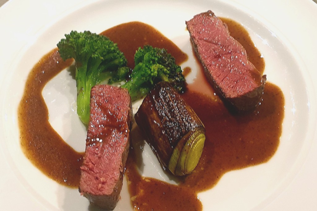 Rehrücken, Brokkoli, gebrannter Lach, RehRotwein Sauce